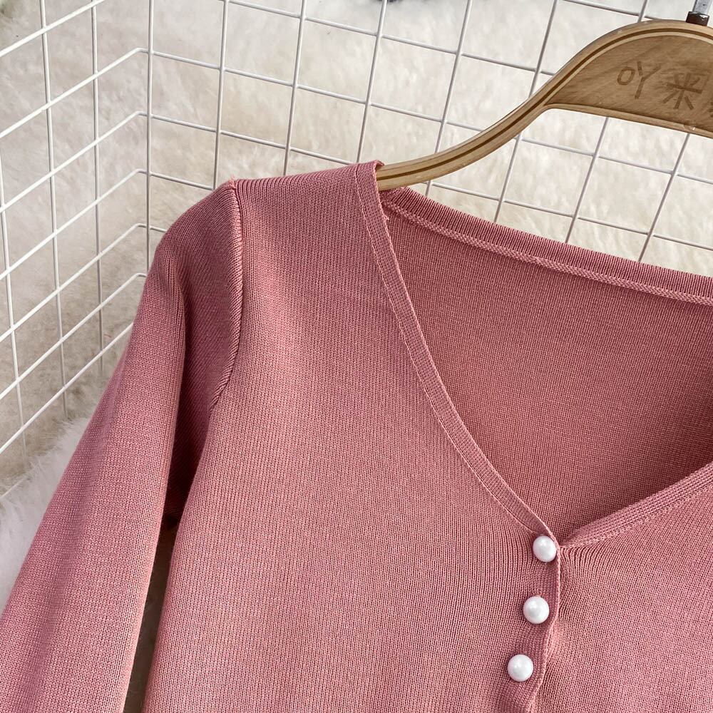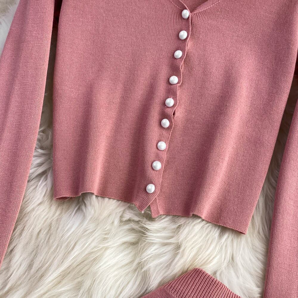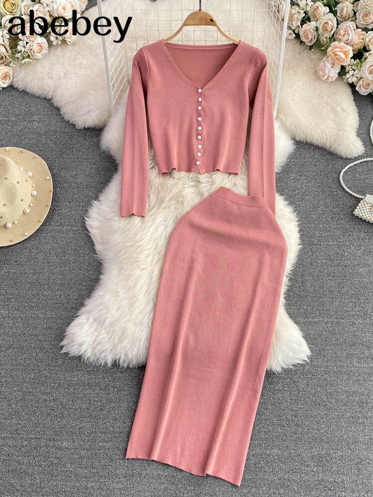 ピンクの女性のシックな 2 枚セット ウエスト セクシーなラップ A 玲ロング スカート + 長袖ニット カーディガン スリム セーター セット Abe80146681449