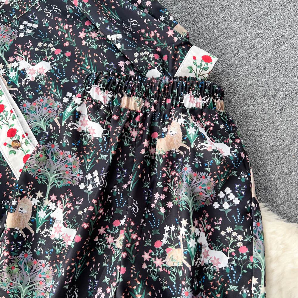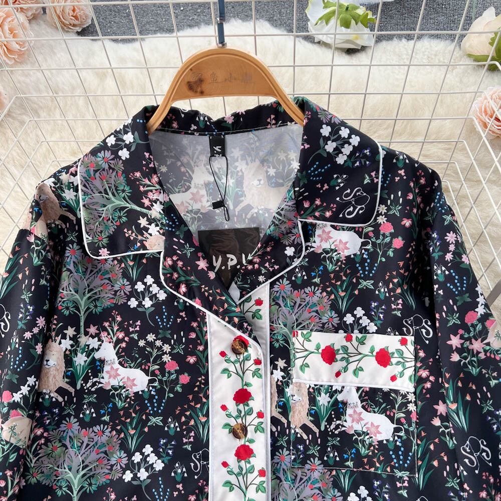 黒プリントツーピーススーツ長袖ブラウス + t ウエストワイドレッグロングパンツオフィスレディ秋セット衣装 ブラック オータム 秋物 ワイドパンツ 会社 学校 通勤や通学にも Abe88430341192