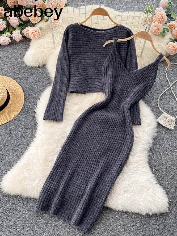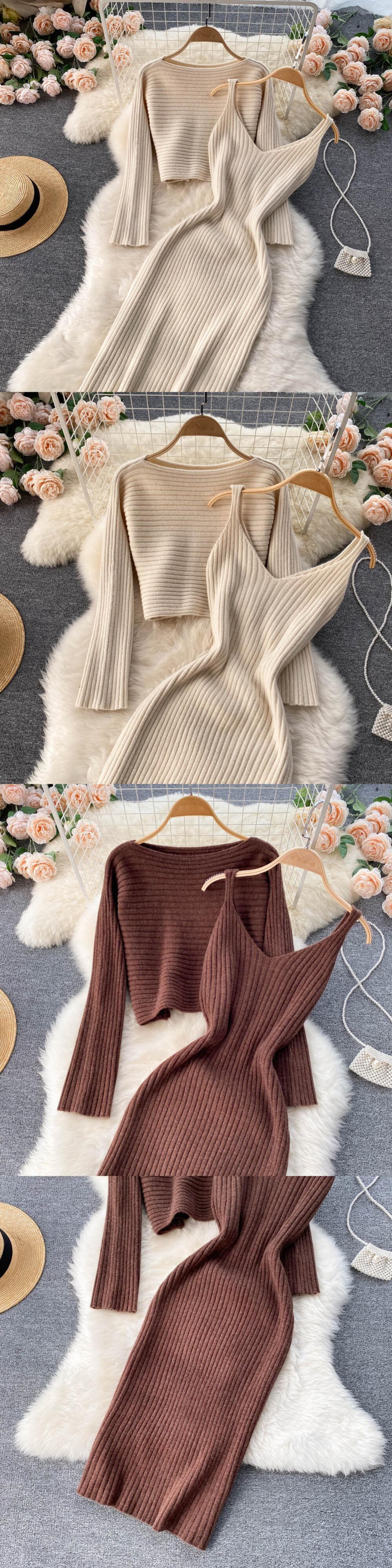 冬の女性のニットセットソリッドロングスリーブパールセーター + ニットキャミソールドレスセットセータースーツ 長袖 ウィンター 冬物 真珠 ソリッドカラー Abe56149561890