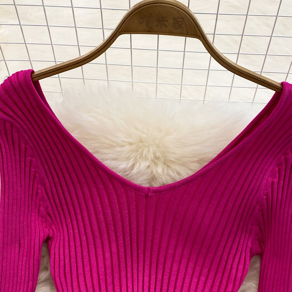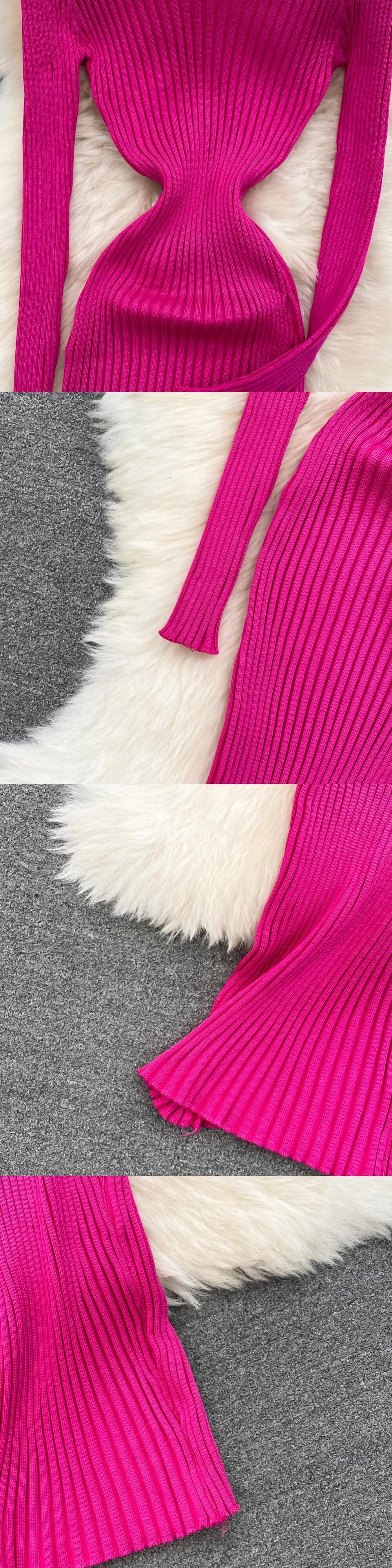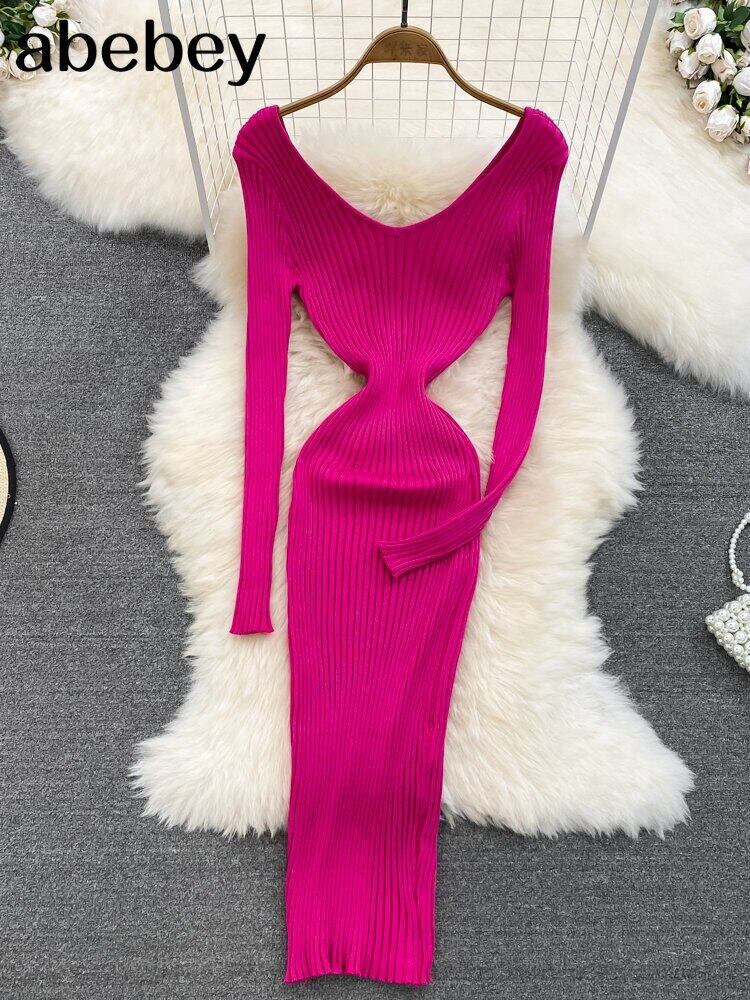 バックレス ドレス V ネック セクシーな女性ボディコン マキシ ドレス スリム ニット プルオーバー長袖ミディ リブ ローブ ロング Vネック Abe32553811579