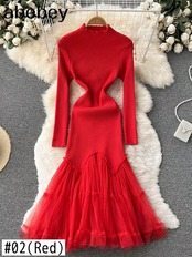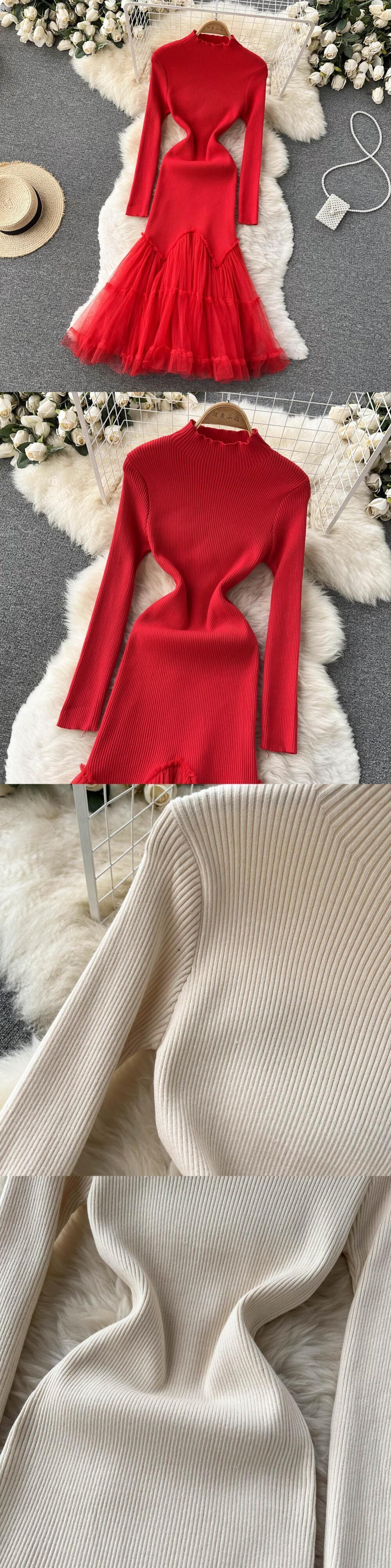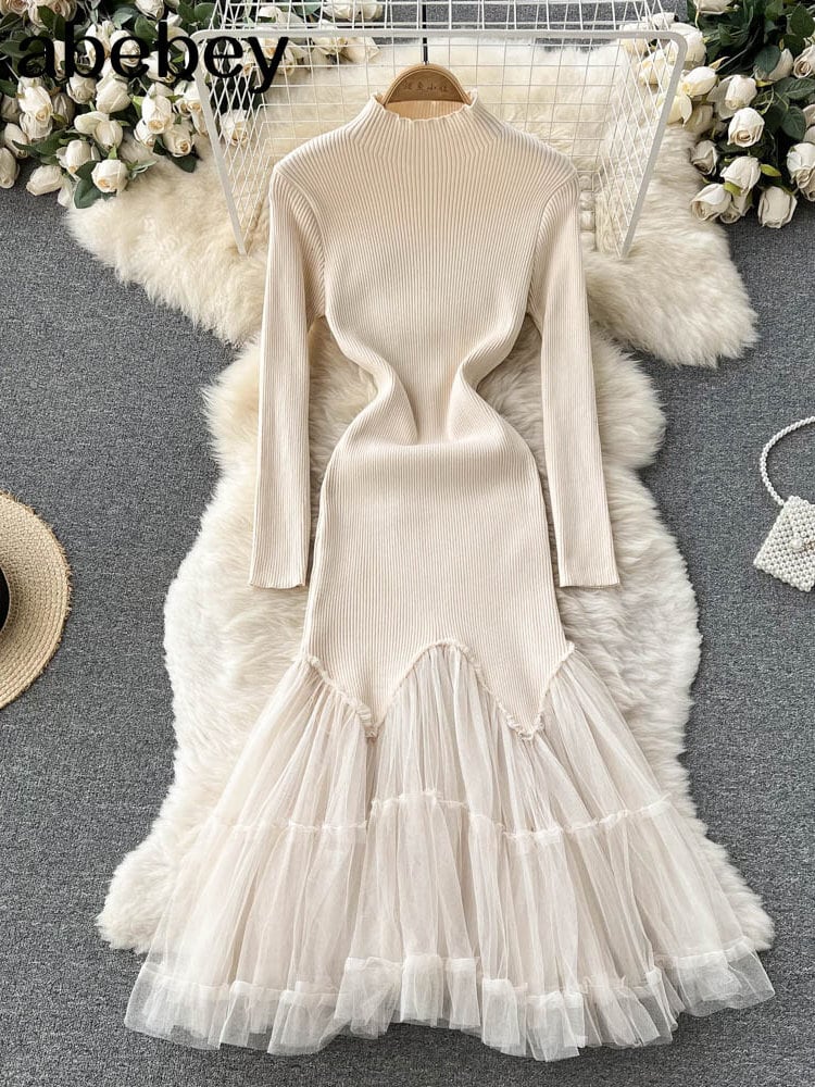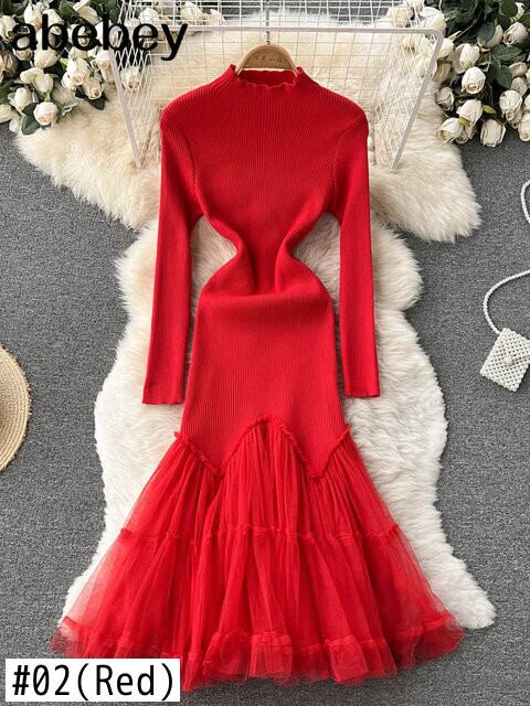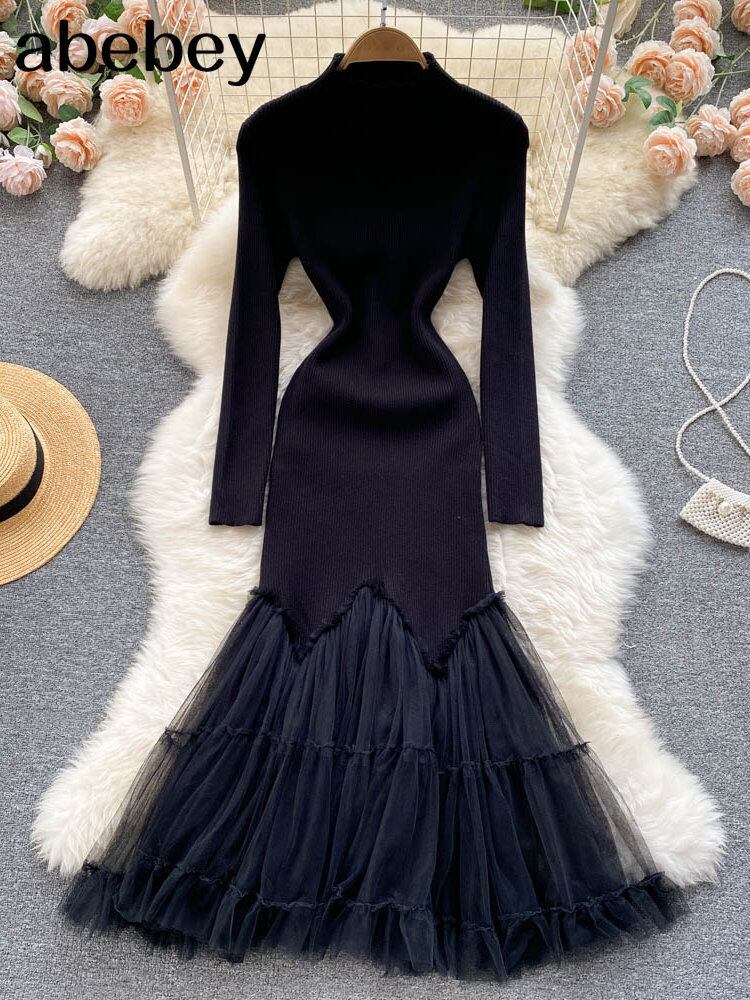 メッシュスプライシングニットドレス女性長袖気質ミディロングドレス冬の固体パーティーファッショナブルなセータードレス ウィンター 冬物 ソリッドカラー Abe86174161917