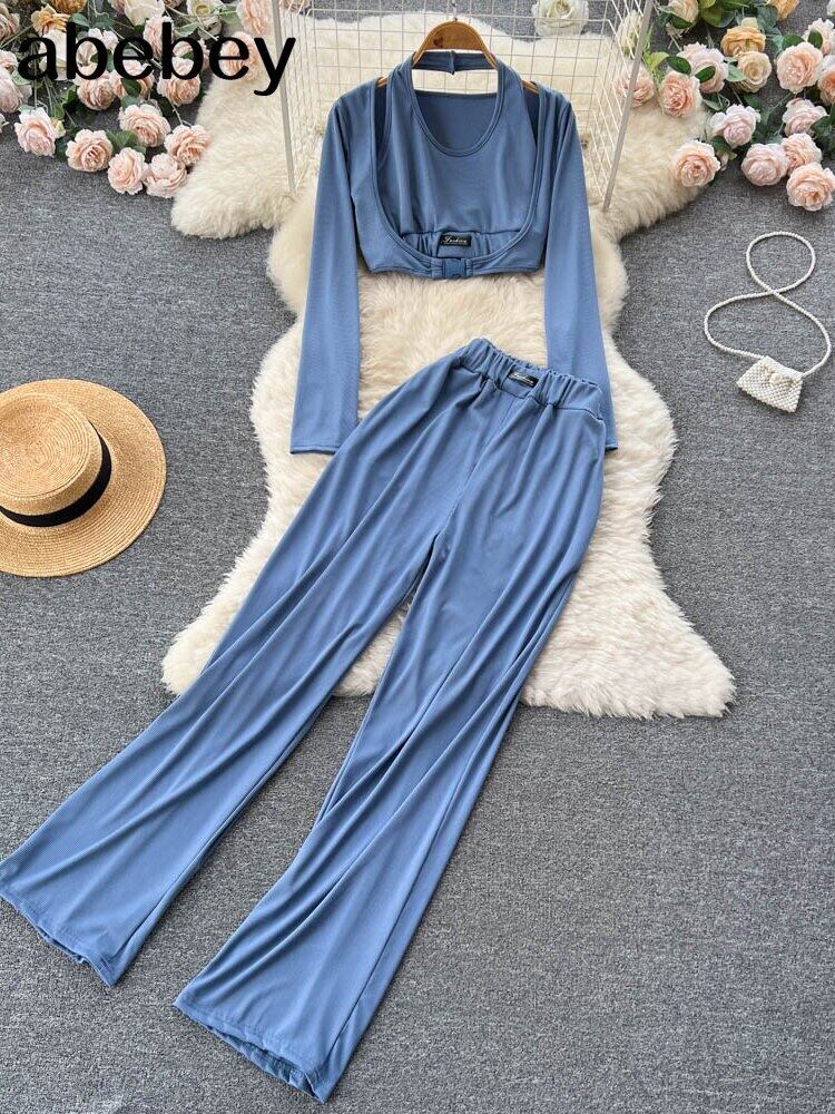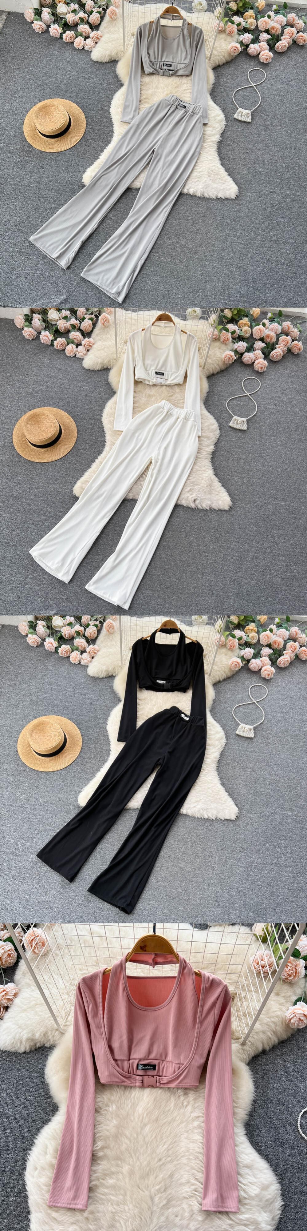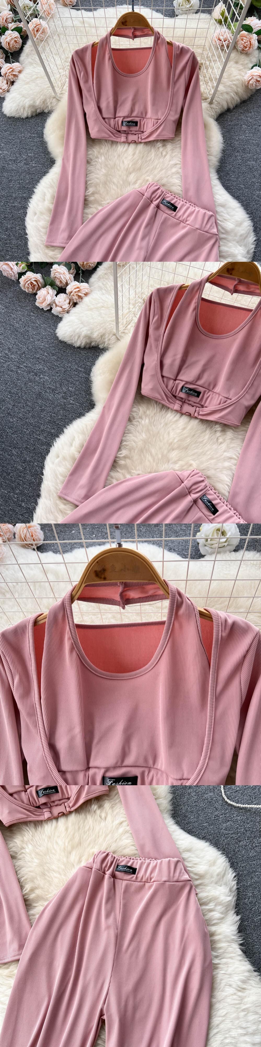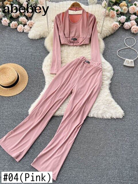 セクシーパンツセット ストラップスーツ サマーニット 長袖コート スリーピースセット アンサンブル クロップトップス アウトフィット ロング 夏物 Abe23635969136