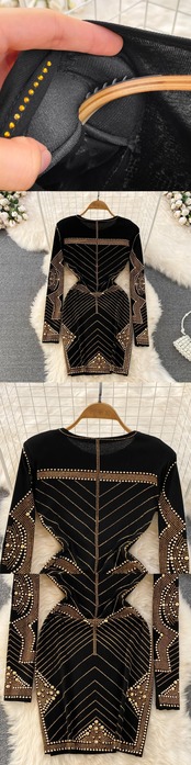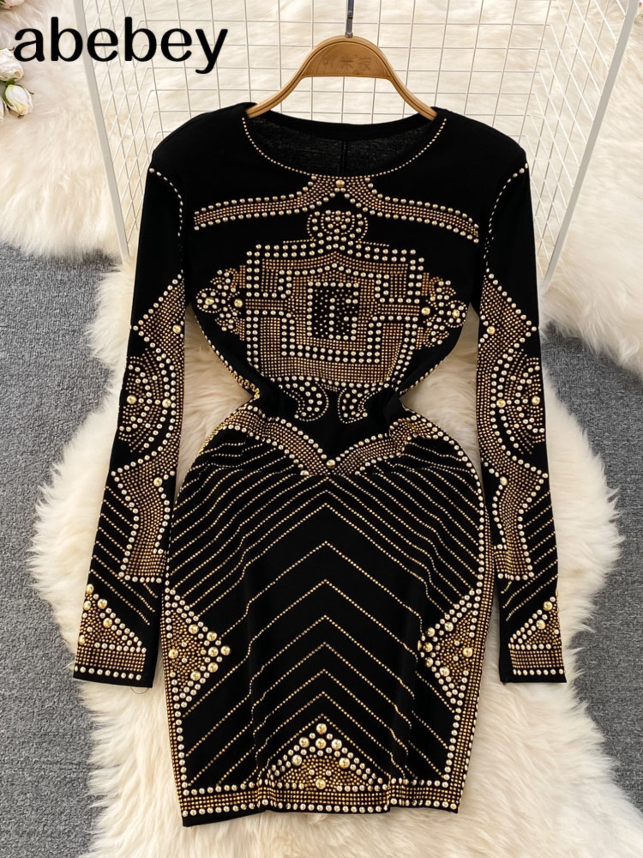 ビーズダイヤモンド黒のセクシーなクラブパーティードレス女性の夏のドレス長袖 O ネックスリムボディコンミニドレス ロング ブラック サマー 夏物 Oネック Abe66451183760
