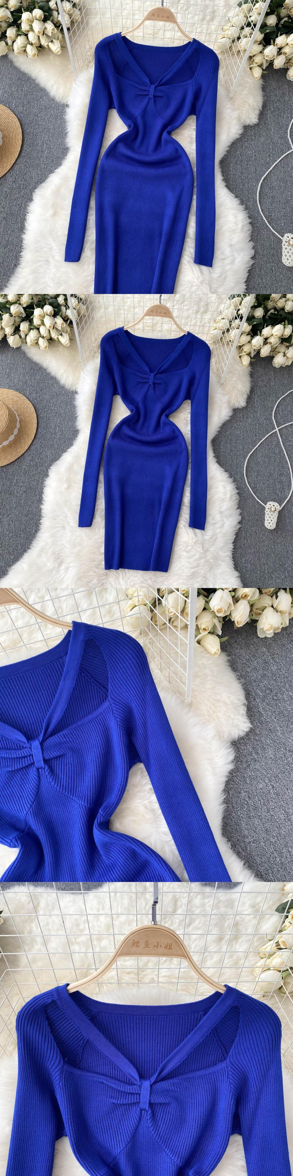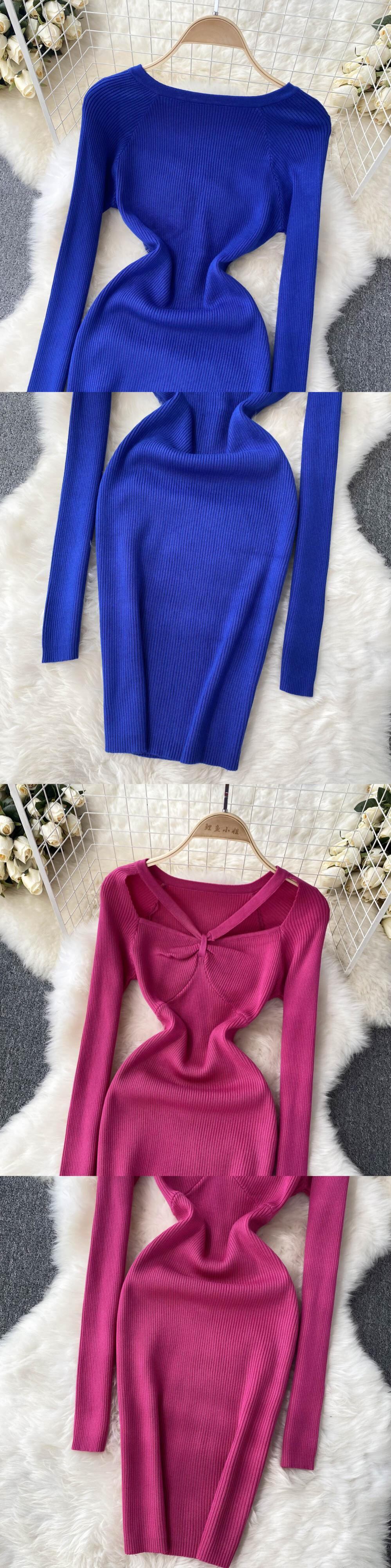 女性ニットペンシルドレス長袖中空アウト弾性スリムドレス秋冬セクシーなボディコン暖かいセーターミニドレス ロング エラスティック 伸縮 オータム 秋物 ウィンター 冬物 Abe92560771913
