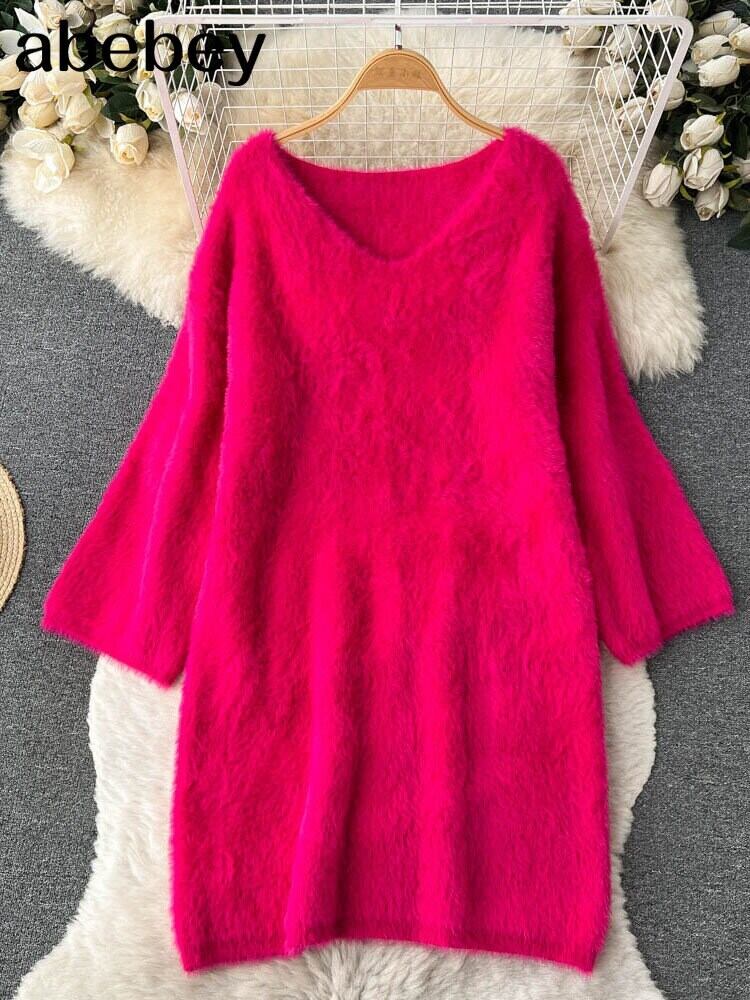 長袖 A ラインニットドレス女性 2022 気質 V ネックソリッドセータードレス秋冬ローブ ロング オータム 秋物 ウィンター 冬物 Vネック Aライン ソリッドカラー Abe1656285447
