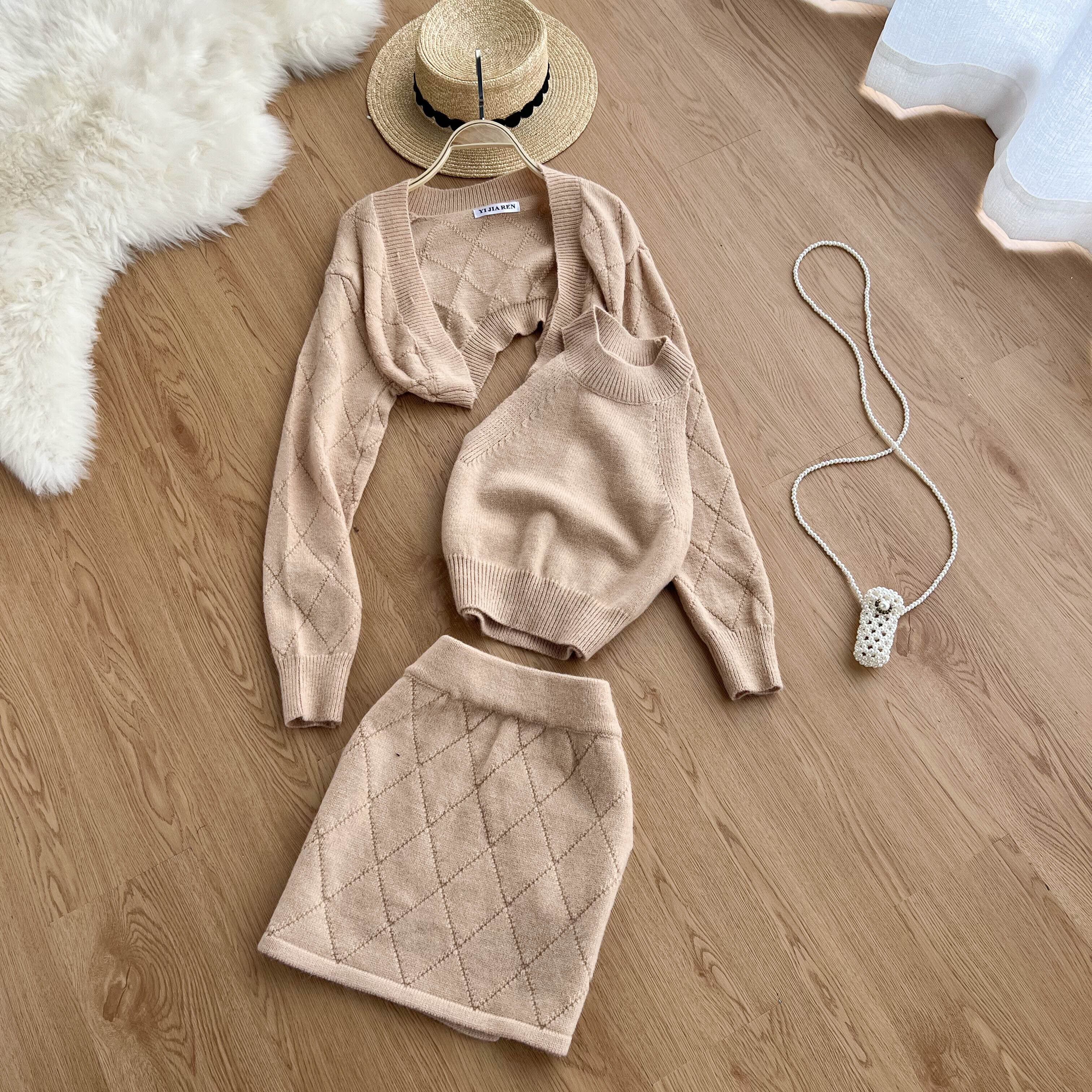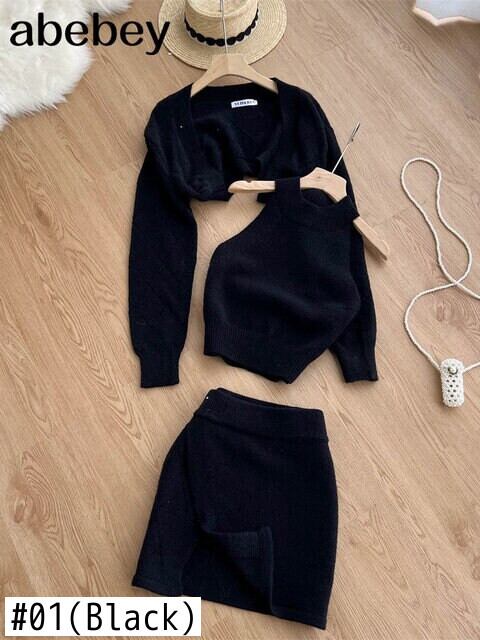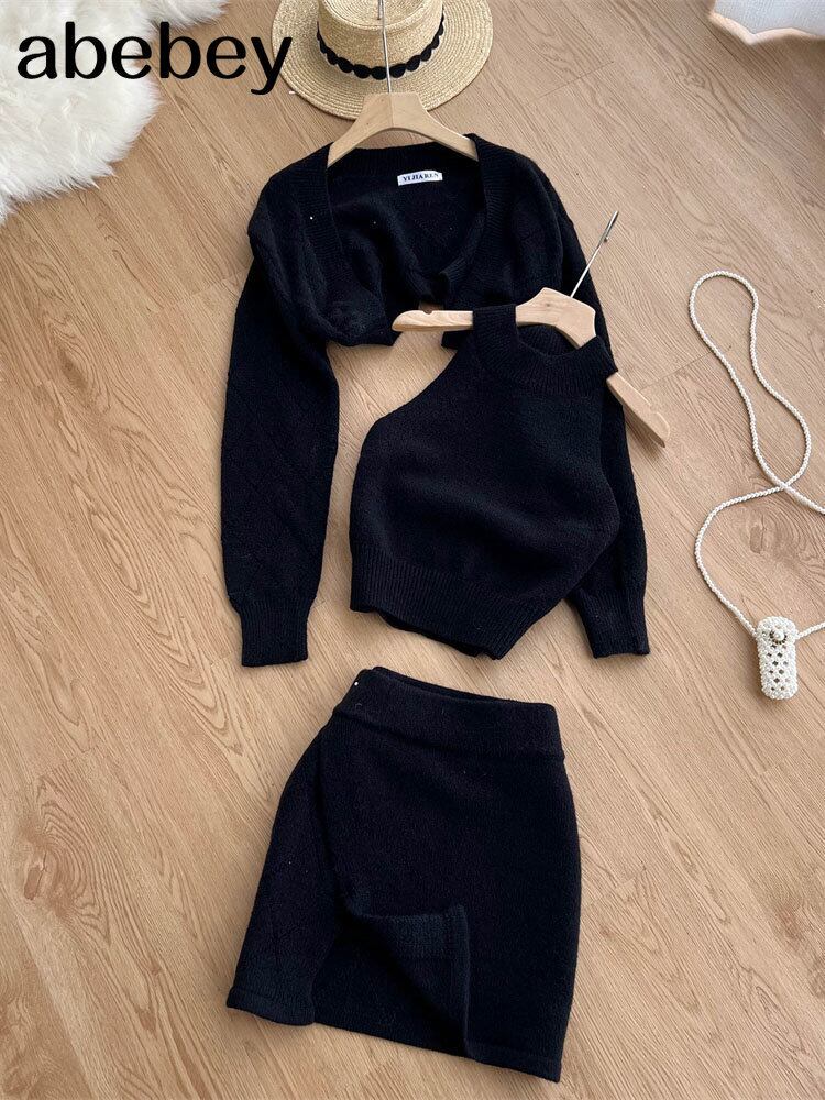 女性トラックスーツシックな 3 点セット ニット 無地ラウンジ スーツ カーディガン セーター + ミニ スカート + ノースリーブ タンクトップ ソリッドカラー Abe54622824777