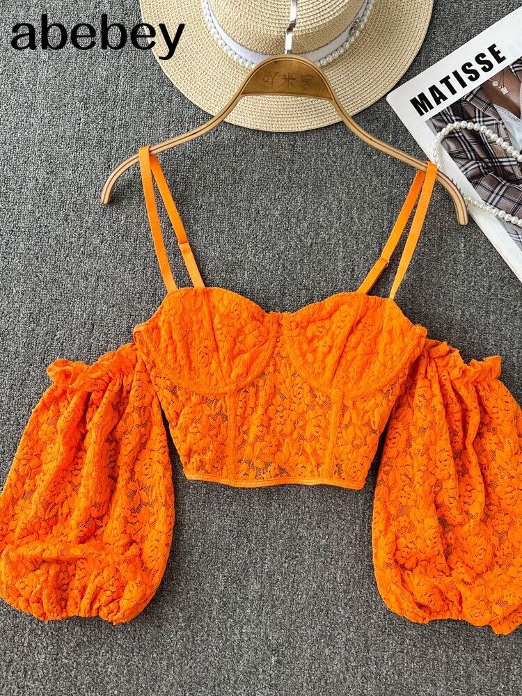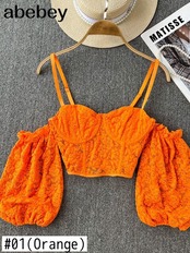 クロップトップス女性 2022 夏ランタンスリーブセクシーなストラップレスビーチトップス赤、黒、白シャーリングクロップトップクロップトップ ホワイト レッド ブラック サマー 夏物 Abe81638744519