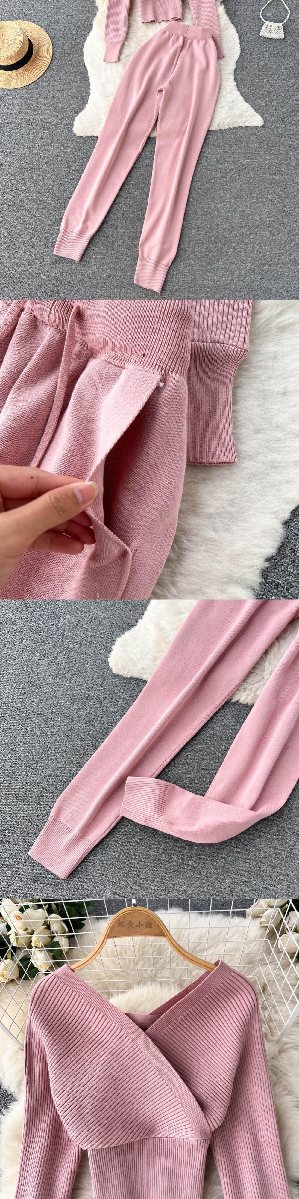 女性の秋のツーピースセット V ネック Blackless プルオーバーセータートラックスーツウエストニットストレートパンツスーツ春服 ブラック スプリング 春物 オータム 秋物 Vネック Abe37452433792