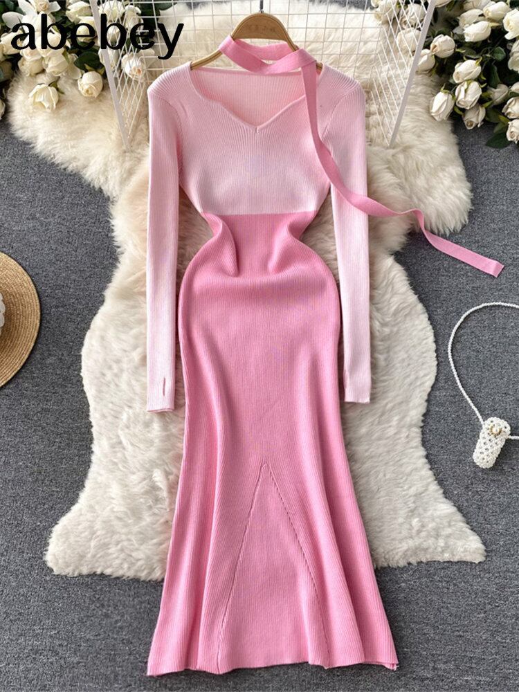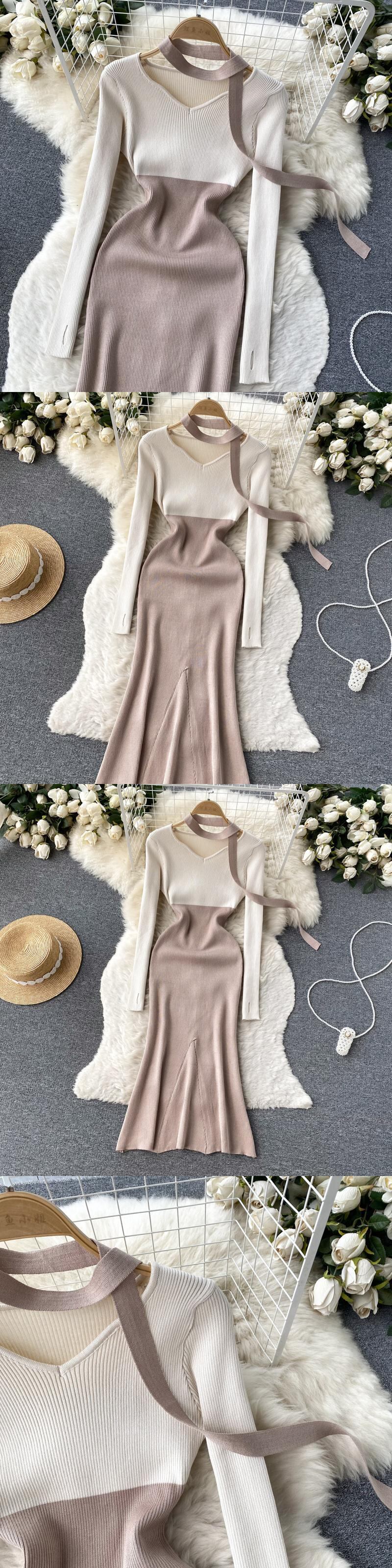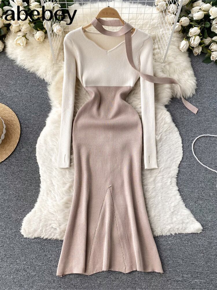セクシーなセータードレス女性 V ネック長袖スリム暖かいミディドレスパーティーパッチワークニットロングドレス Vネック Abe73085065950