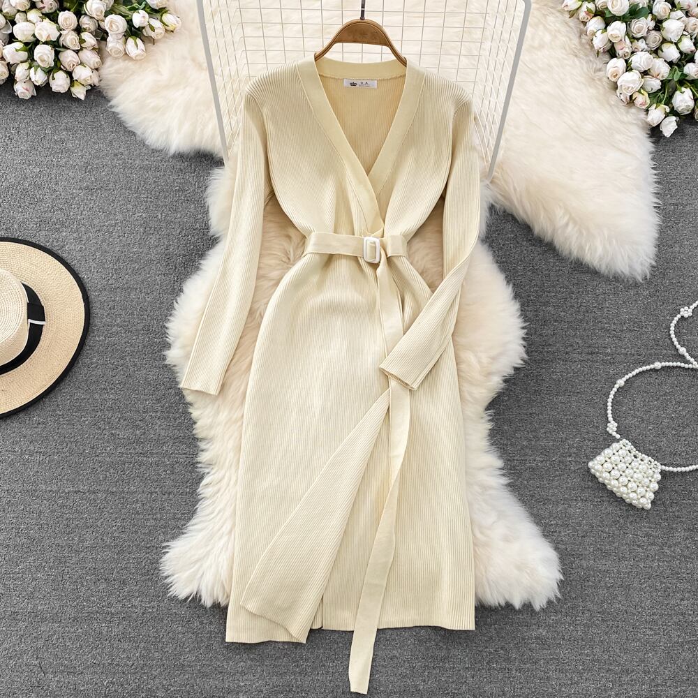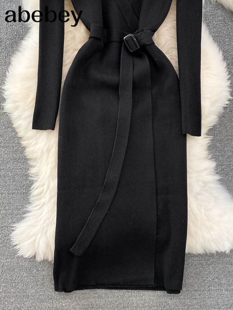 ディープ V ネック ニット ドレス クロス タイ長袖シース A ライン ドレス女性秋のパーティー ミディ ロング ドレス オータム 秋物 Vネック Aライン Abe6487398618