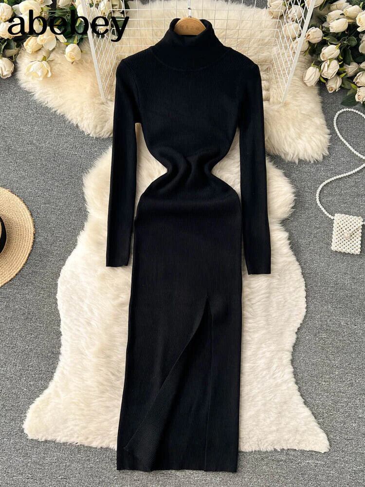 タートルネックのセクシーなニットロングドレス気質長袖弾性ウエスト分割女性の冬の固体パーティーセータードレス エラスティック 伸縮 ウィンター 冬物 ソリッドカラー Abe99392934271