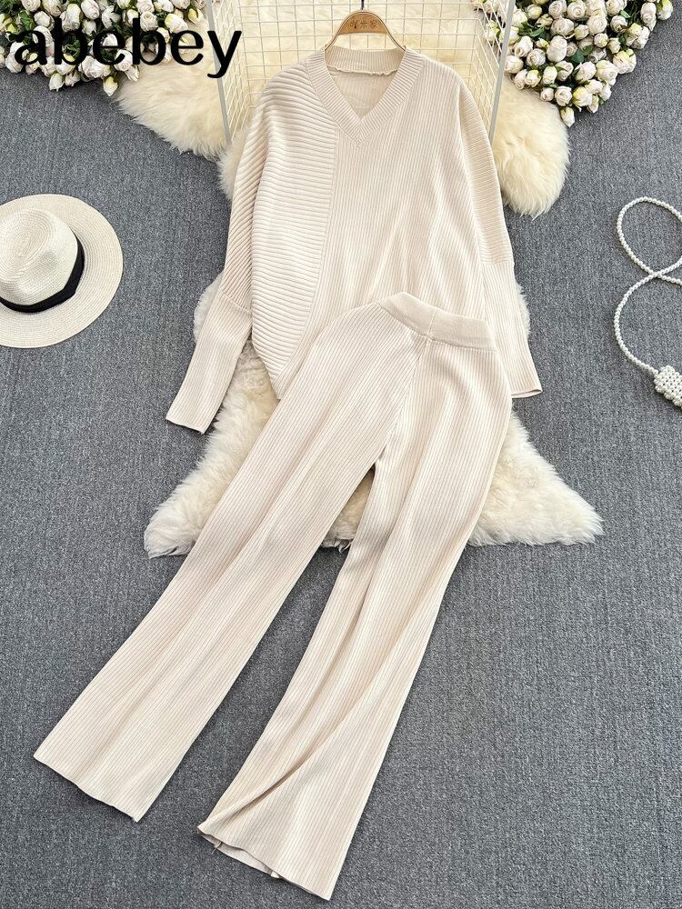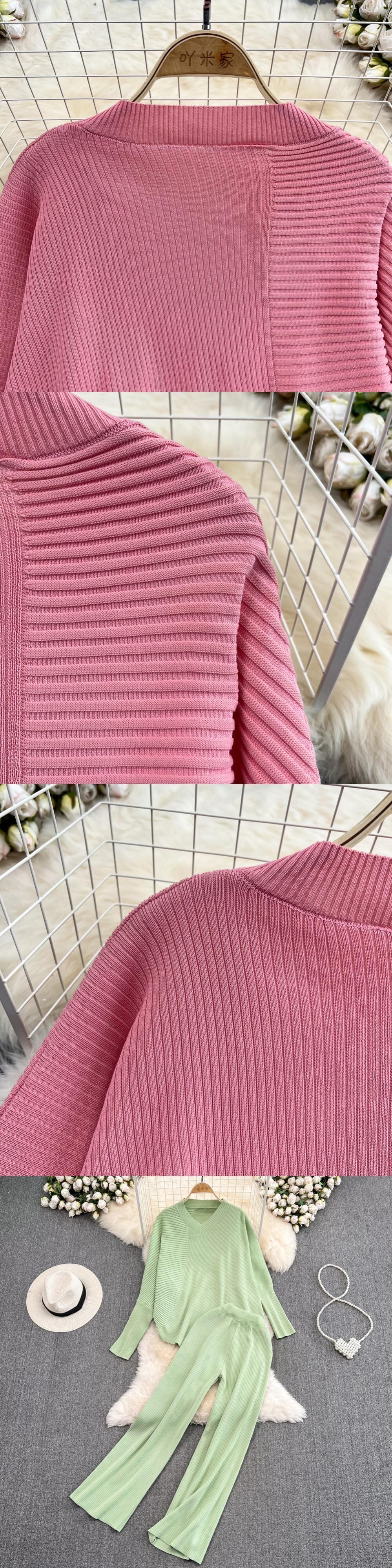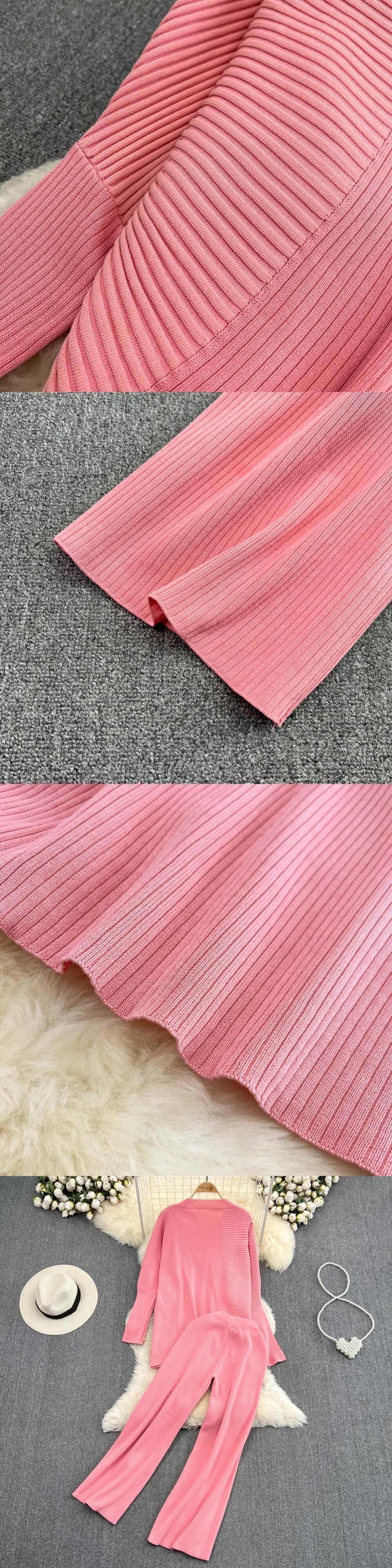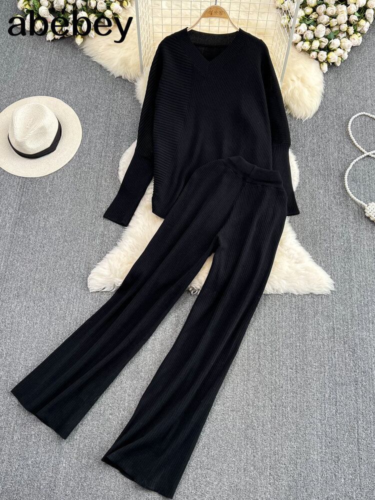 冬のツーピーススーツ長袖ニットトップコート + 弾性ウエストワイドレッグパンツルーズセーターセット ロング エラスティック 伸縮 ウィンター 冬物 ワイドパンツ Abe90972718459
