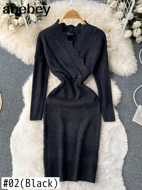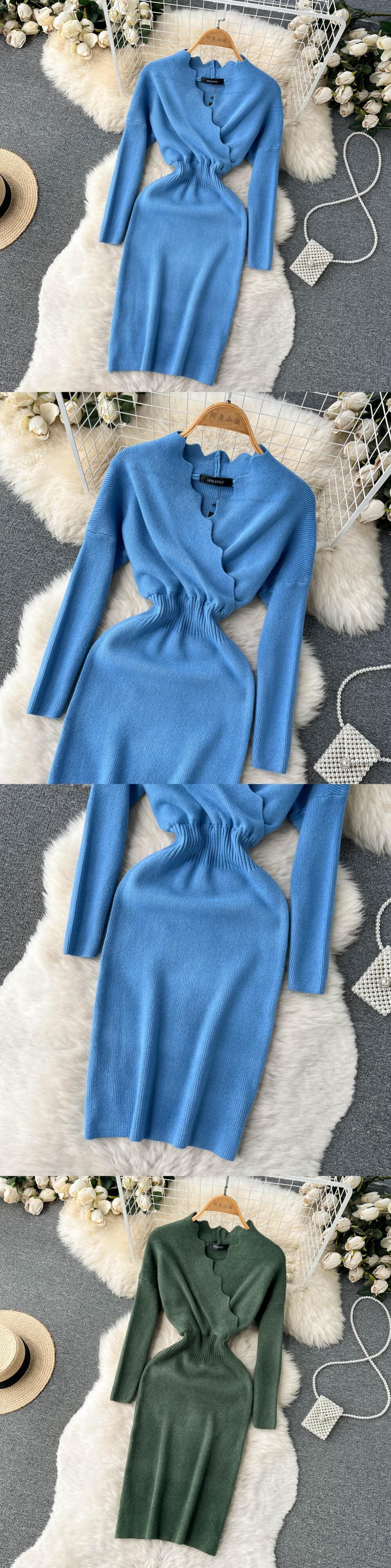 グリーン女性ニットペンシルドレス長袖 V ネック弾性スリムドレス秋冬セクシーなボディコン暖かいセータードレス ロング エラスティック 伸縮 オータム 秋物 ウィンター 冬物 Vネック Abe44947682112