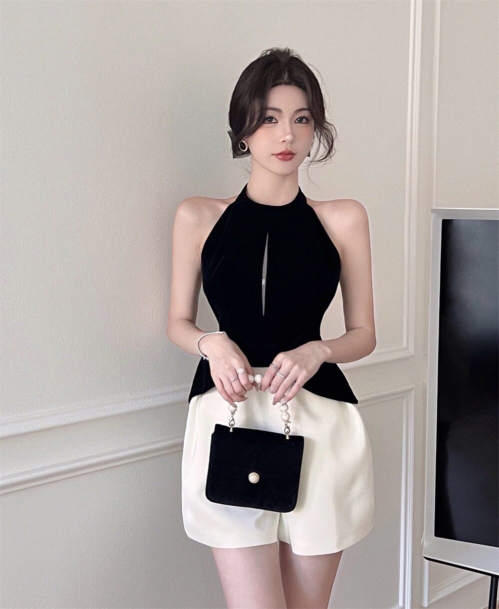 2022 夏の滑走路の女性パッチワークショーツ遊び着ブラックレスのセクシーなホルターネックロンパース Rufless パーティーロンパース遊び着 サマー 夏物 ブルマー Rhc43988925549