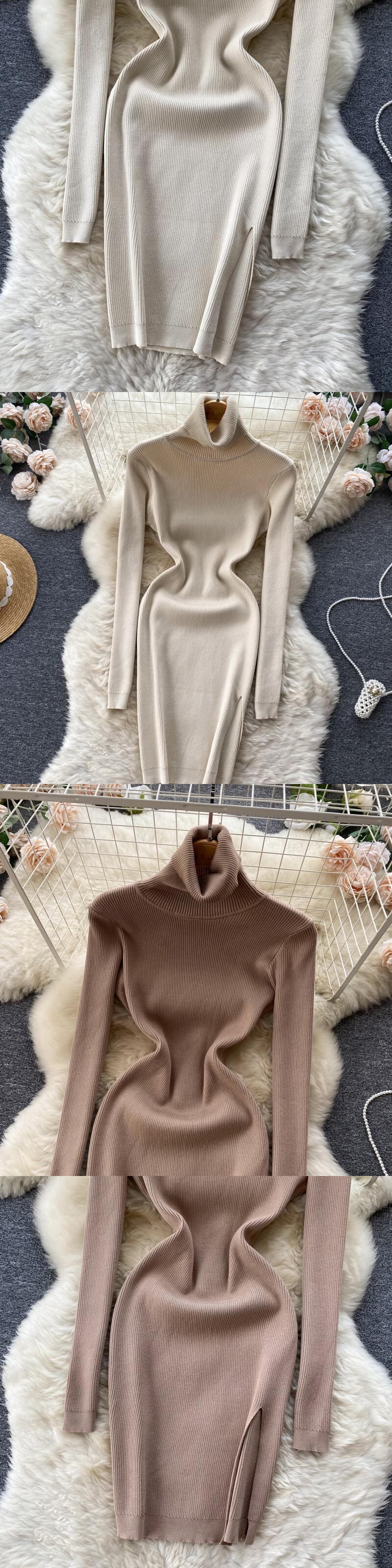 秋のスプリットタートルネックニットドレス長袖スリム固体弾性暖かいドレス 2022 ショートセータードレス ロング エラスティック 伸縮 オータム 秋物 ソリッドカラー Abe92626484743