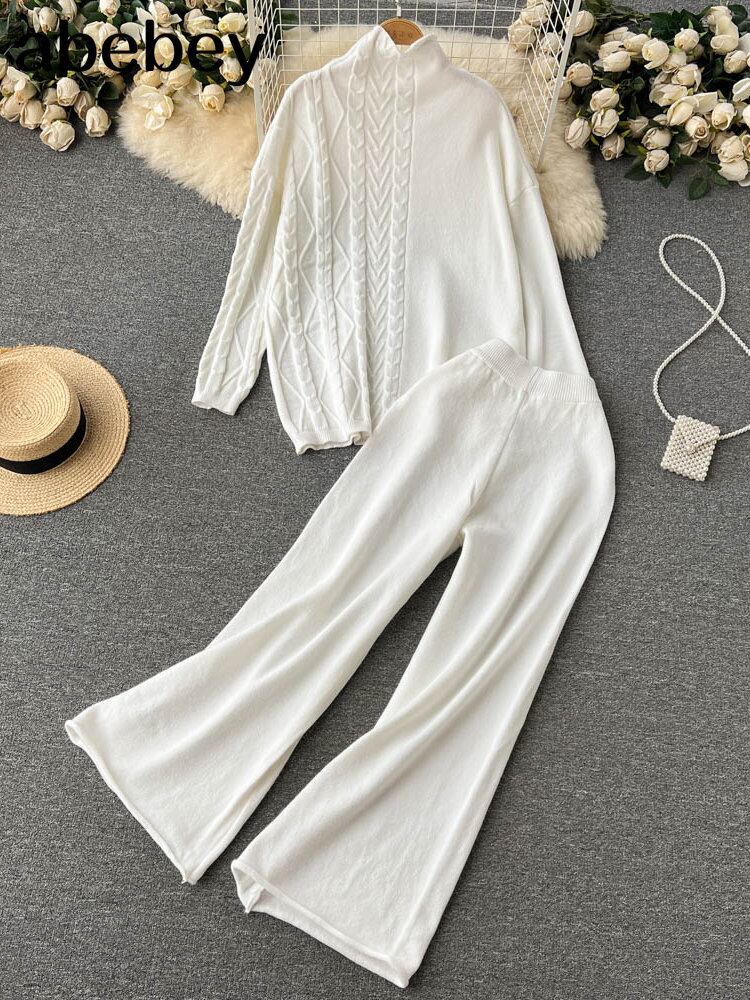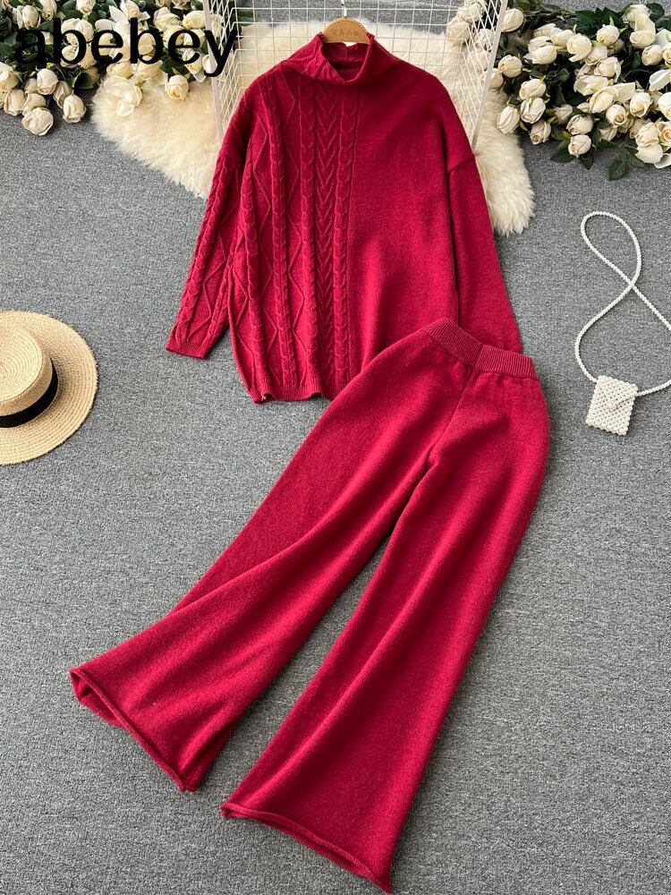 ニットセット冬の女性長袖タートルネックプルオーバー + ワイドレッグパンツルーズセーター二枚スーツ ロング ウィンター 冬物 ワイドパンツ Abe49961410105
