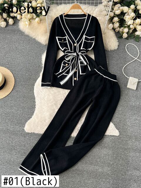 冬の Paneled ニット セット長袖 V ネック ネクタイ ニット + ワイドレッグ パンツ女性 OL セーター 2 ピース スーツ ロング ウィンター 冬物 Vネック ワイドパンツ Abe16704087289