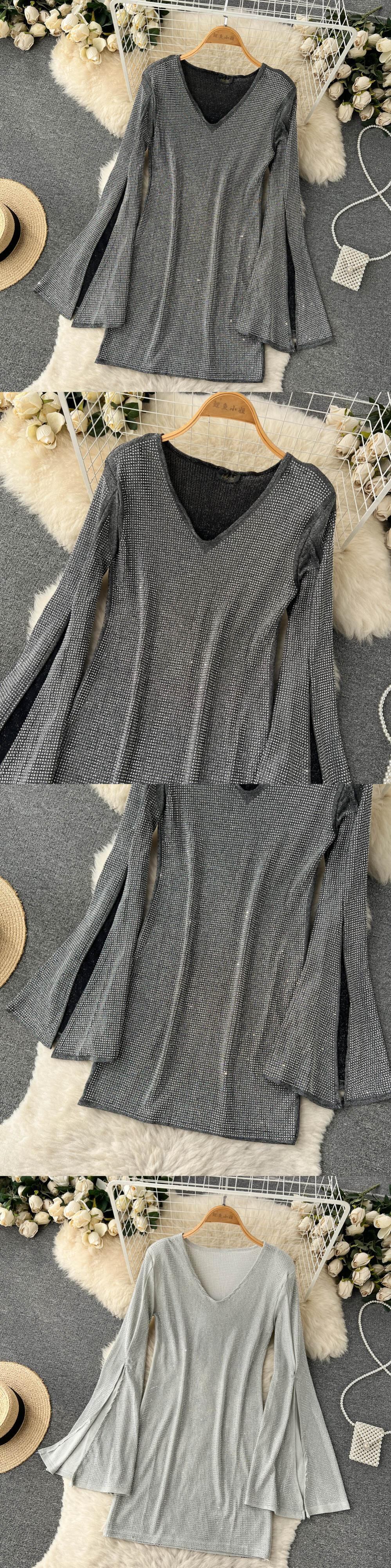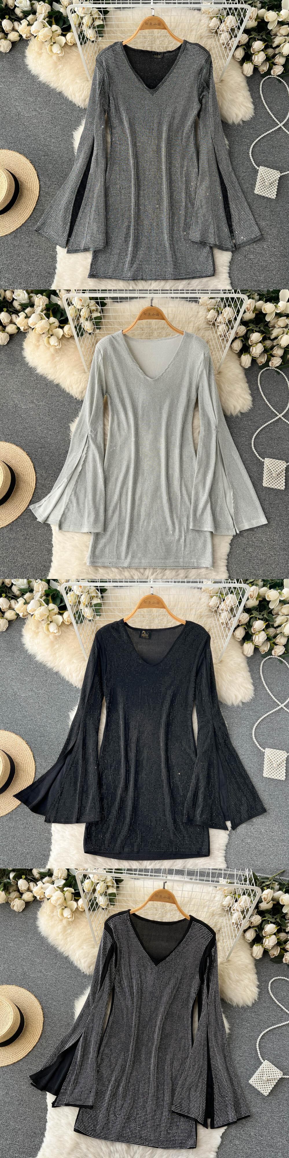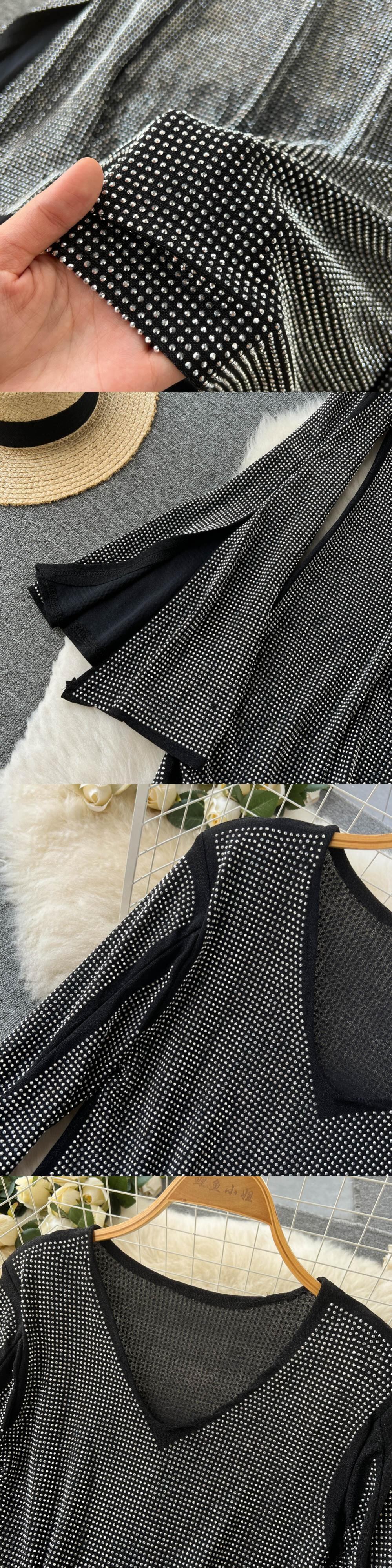 秋の女性のセクシーな黒ブリンブリンダイヤモンドボディコンミニドレス春 V ネック長袖ウエストパーティー Vestidos ロング ブラック スプリング 春物 オータム 秋物 Vネック Abe16014927127