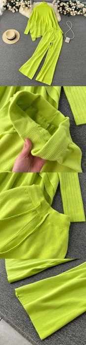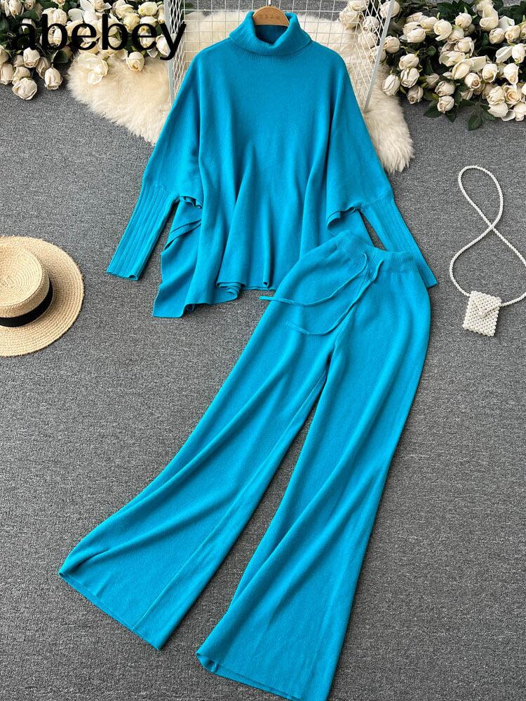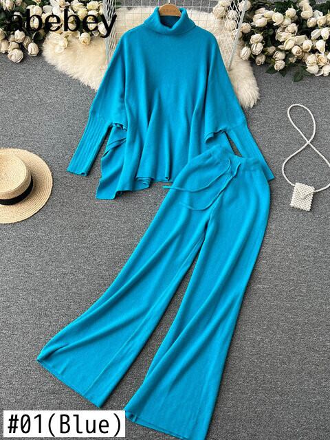 ニットセット冬の女性長袖タートルネックプルオーバー + ワイドレッグパンツルーズセーター二枚スーツ衣装 ロング ウィンター 冬物 ワイドパンツ Abe5514819806