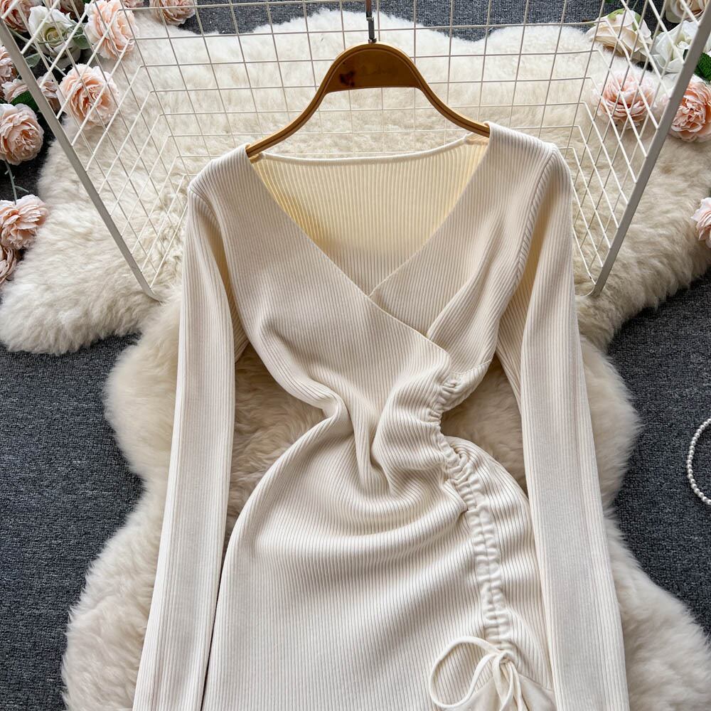女性ひだストライプニットドレス長袖弾性スリムロングドレス巾着冬パーティーフィッシュテールセータードレス エラスティック 伸縮 ウィンター 冬物 Abe83542346197