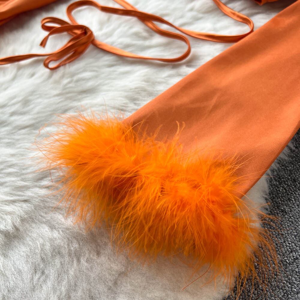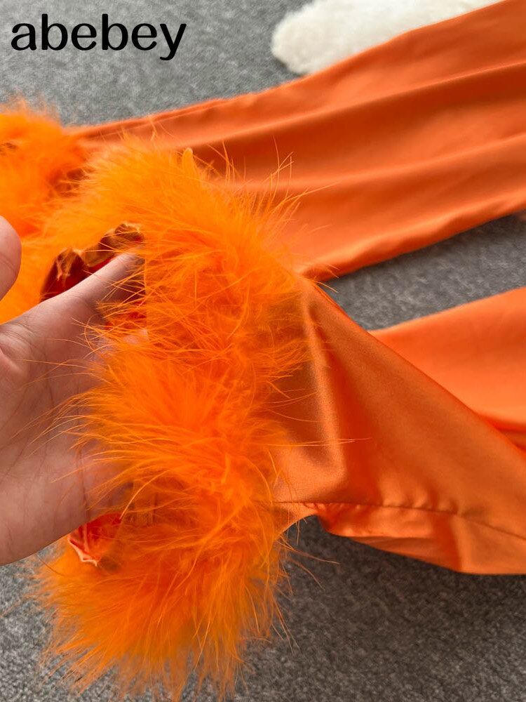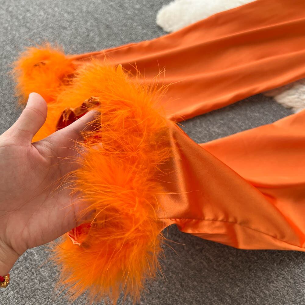 オレンジ女性の夏のシックなスーツセクシーな O ネックショートトップス + ウエストワイドレッグスプリットロングパンツ 2 点セット サマー 夏物 Oネック ワイドパンツ Abe36166617773