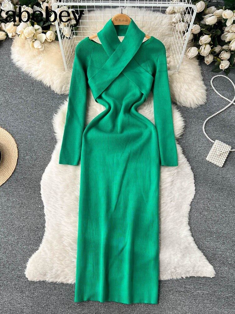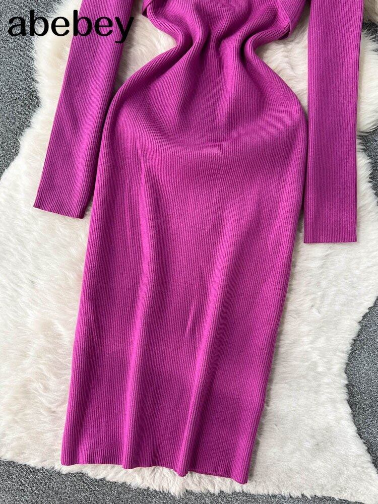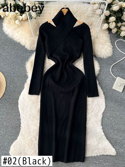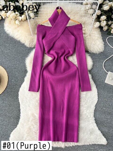 女性ニットペンシルドレス長袖オフショルダー弾性スリムドレス秋冬セクシーなボディコン暖かいセータードレス ロング エラスティック 伸縮 オータム 秋物 ウィンター 冬物 Abe43415458709
