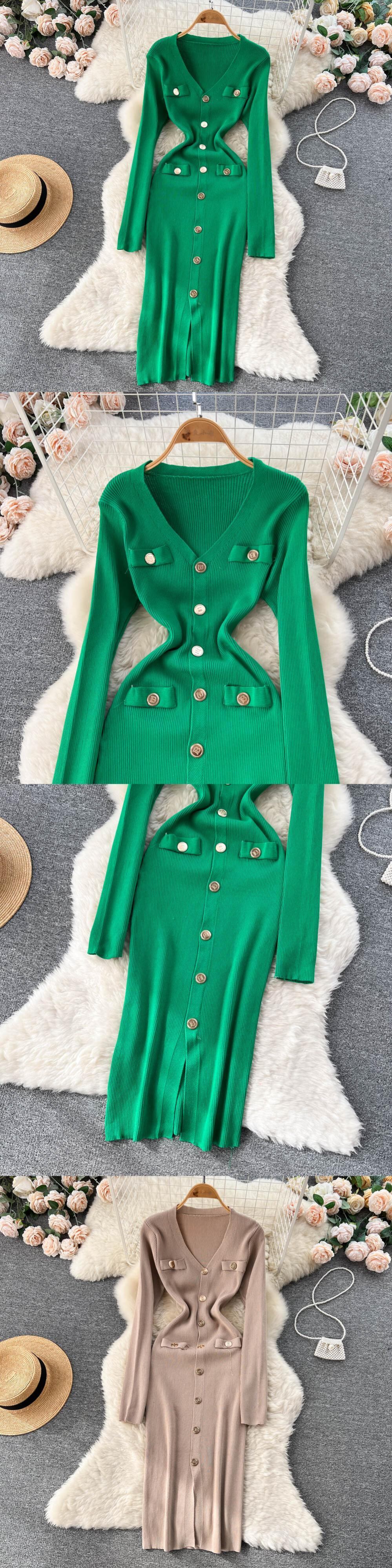 無地パーティーニットワンピース アメリカンスタイル シングルブレスト Vネック スキニー 2022 冬 スプリットセーター ミディドレス ウィンター 冬物 ソリッドカラー Abe84977900596