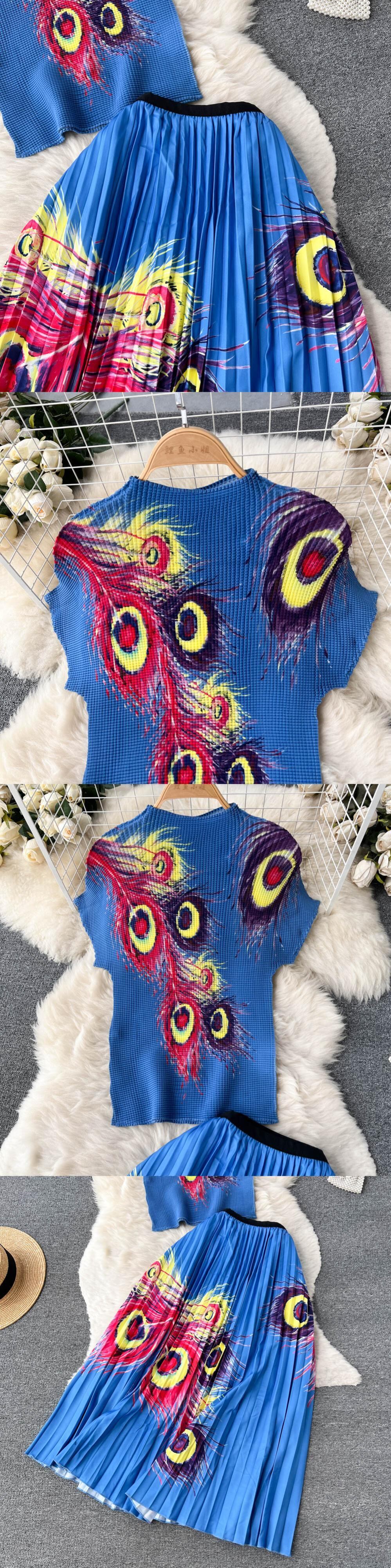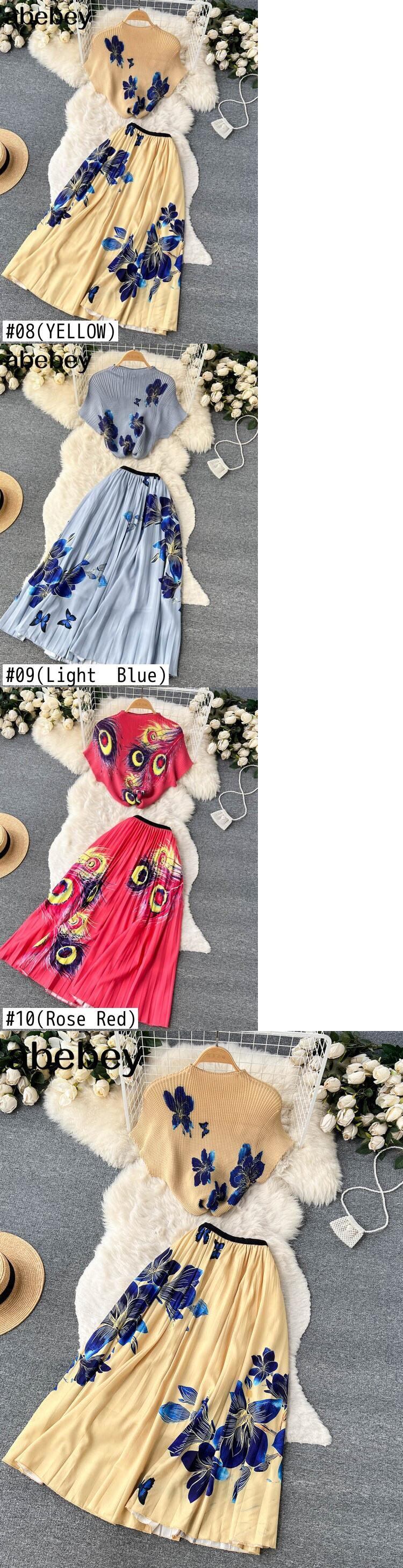 ボヘミアンバケーションビーチ 2 個セット女性花柄プリント半袖トップスとウエストプリーツロングスカートスーツ春夏 ショート ハーフスリーブ スプリング 春物 サマー 夏物 Abe19055964679