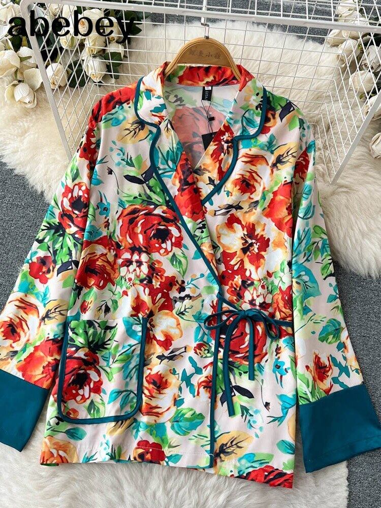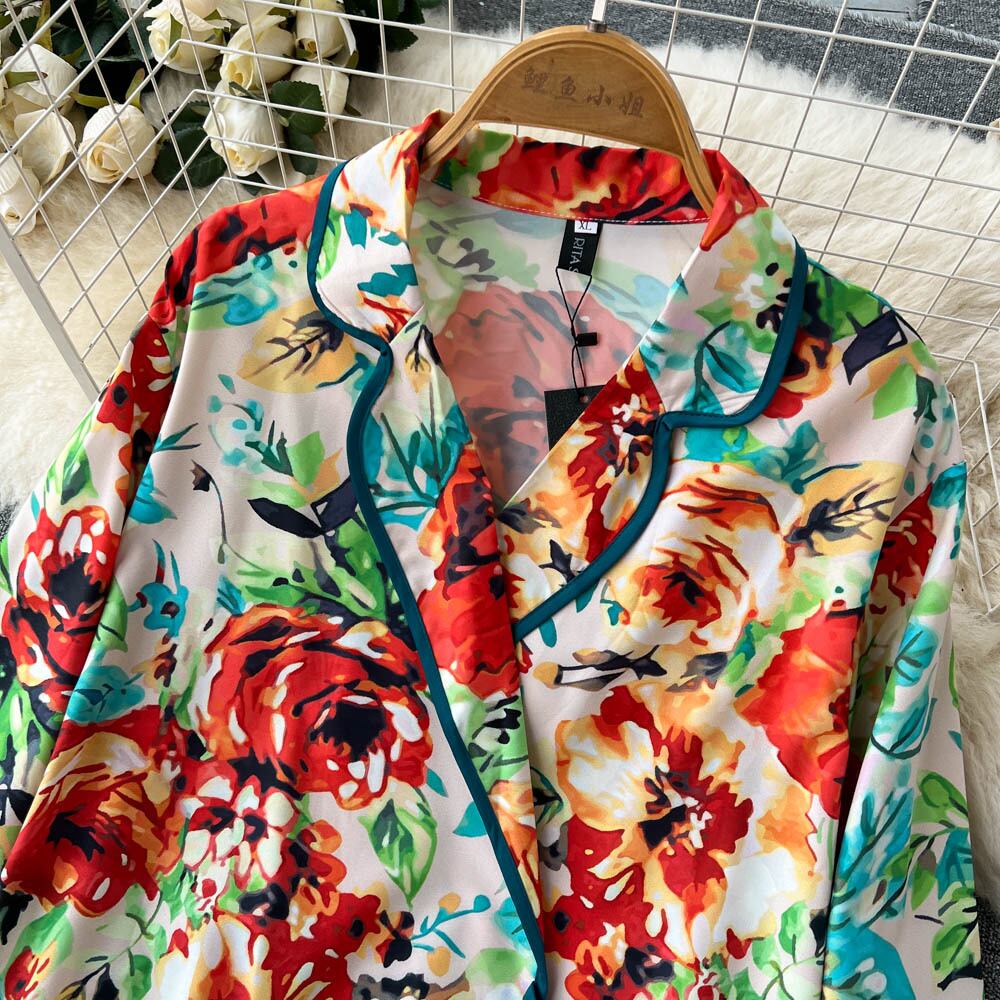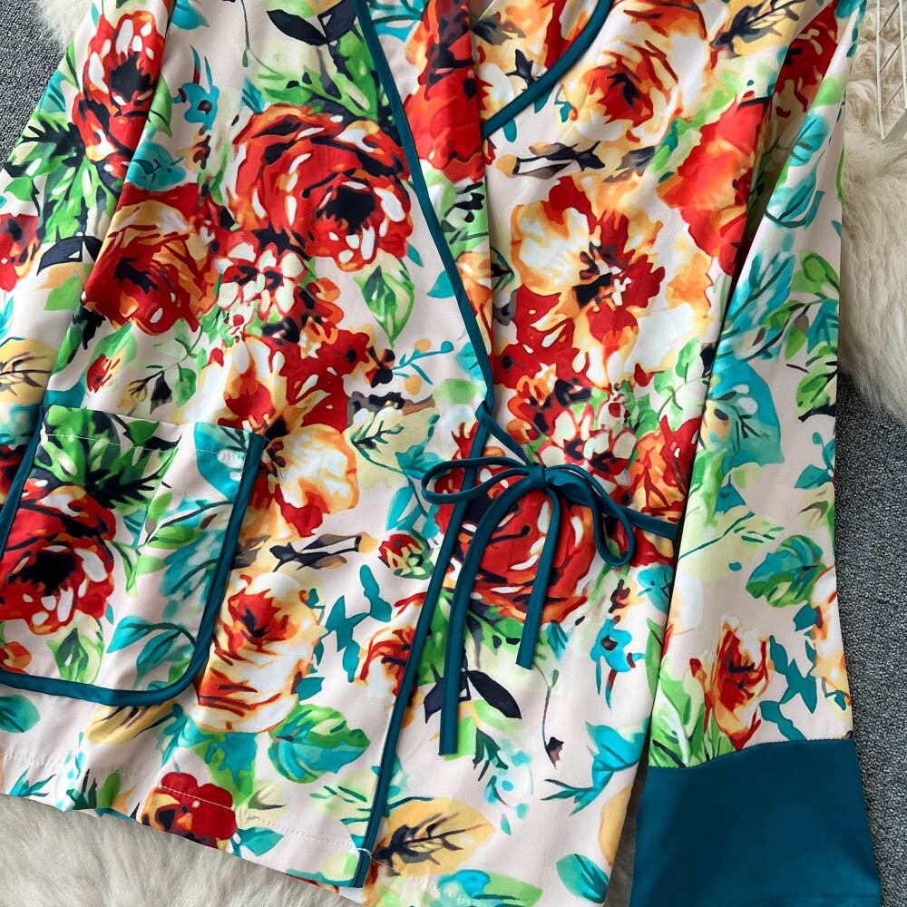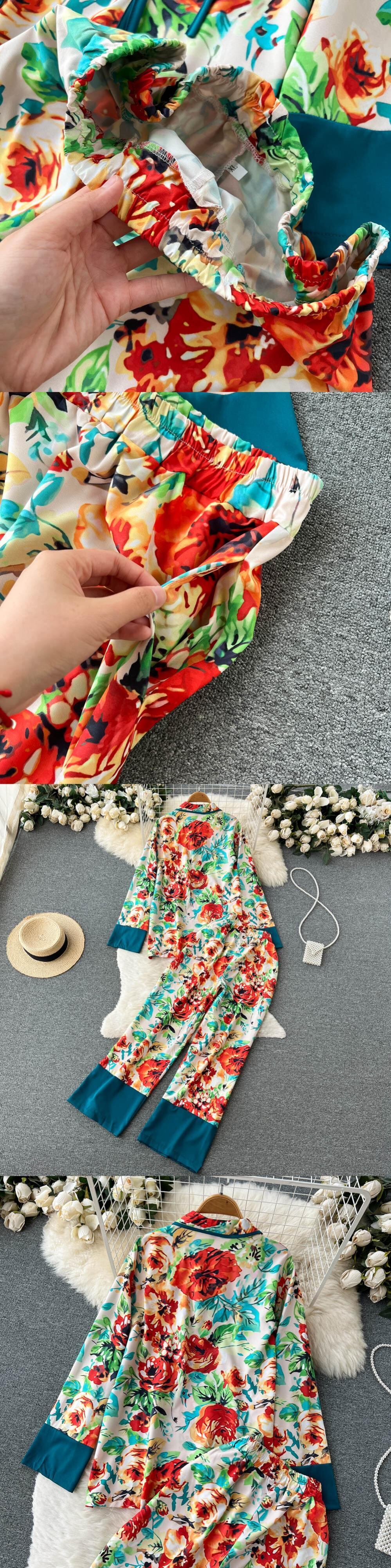 フラワープリント3ピース女性スーツVネック長袖サッシブレザー+ウエストワイドレッグパンツ2022セット ロング ワイドパンツ フラワーデザイン Abe97972225330
