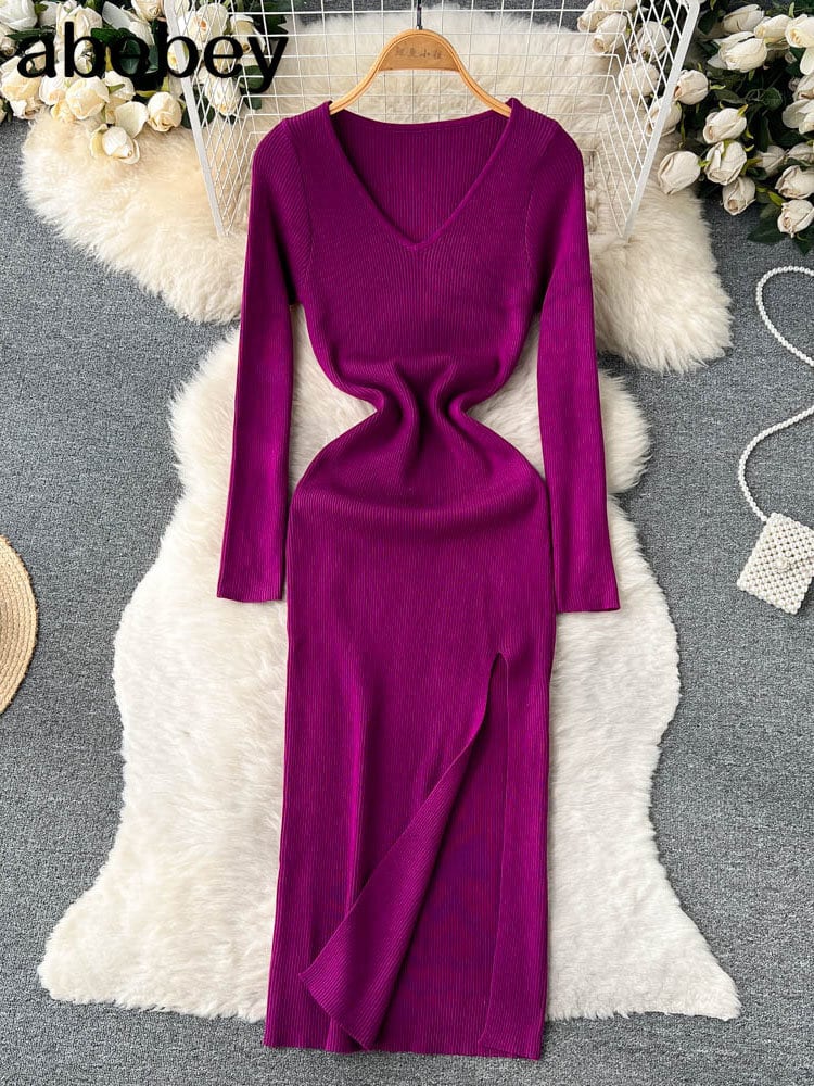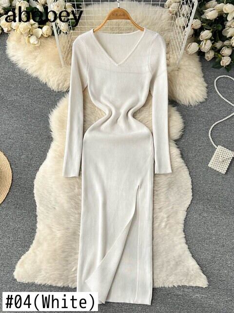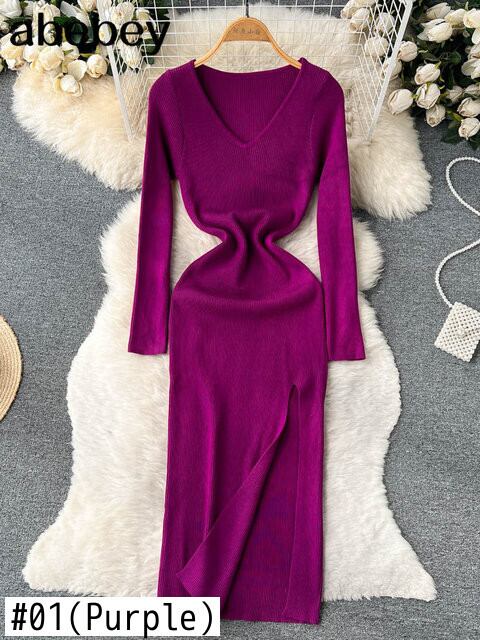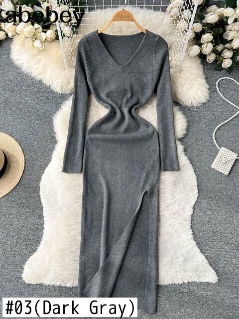 分割女性ニットペンシルドレス長袖 V ネック弾性スリムドレス秋冬セクシーなボディコン暖かいセータードレス ロング エラスティック 伸縮 オータム 秋物 ウィンター 冬物 Vネック Abe647831721