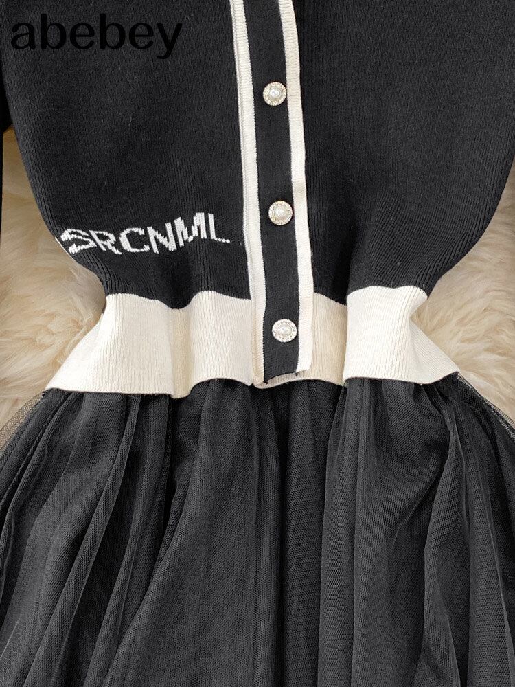 黒人女性ニットロングドレスメッシュ冬 2022 プリーツ A ラインミディドレス V ネックリブローブ ブラック ウィンター 冬物 Vネック Aライン Abe10980238764