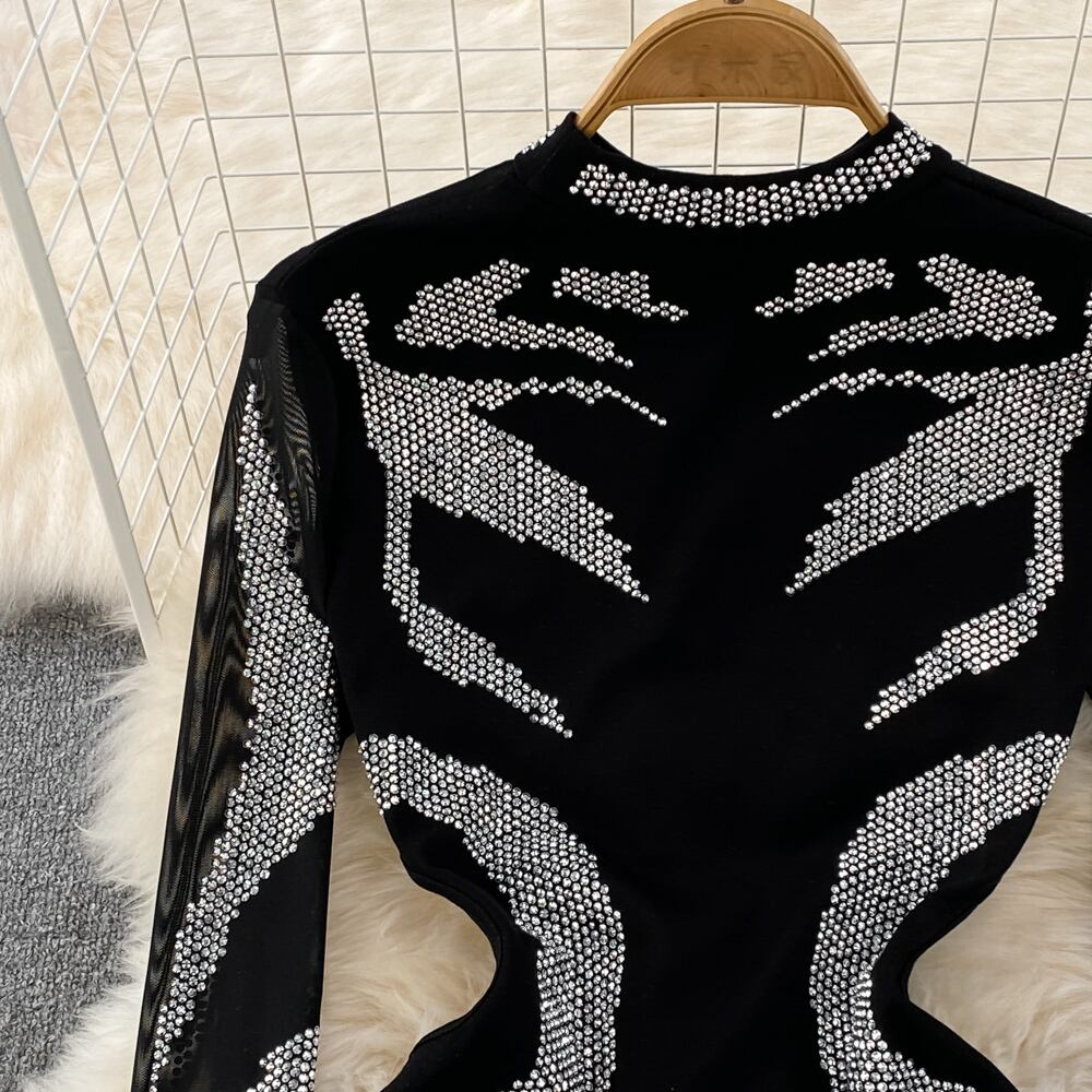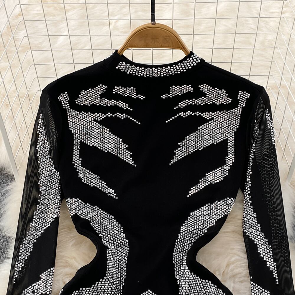 セクシーな黒のパーティードレス女性年イブニングボディコンドレス長袖キラキラクリスタルビーズクラブ誕生日ドレス ロング ブラック Abe85004151574