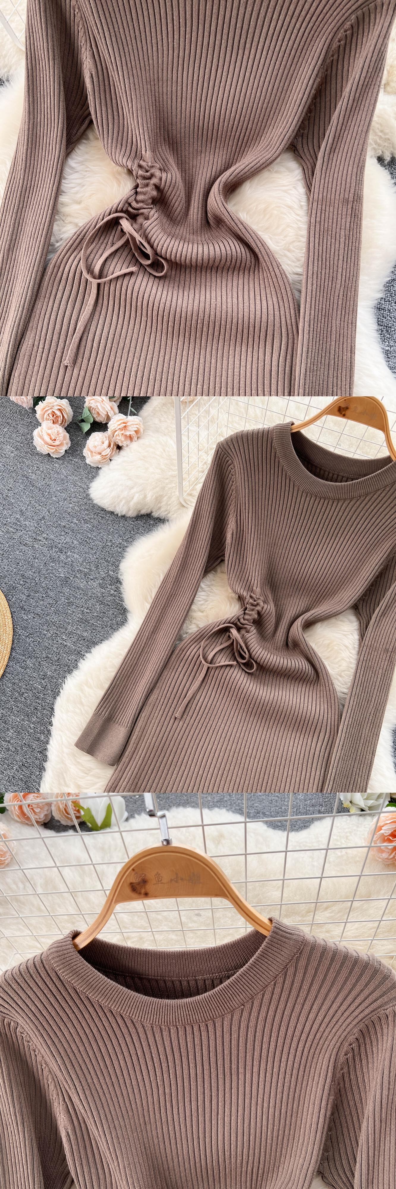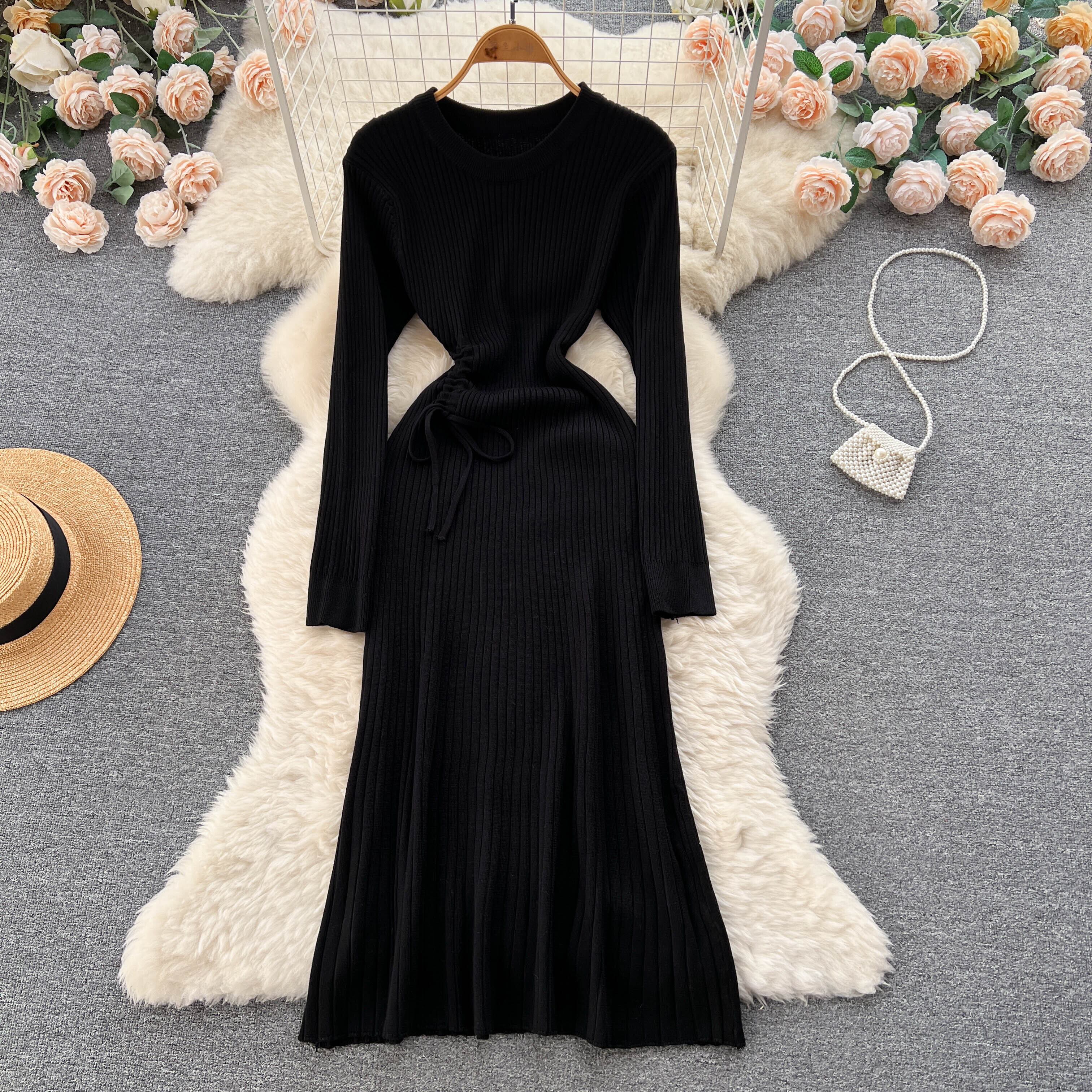 女性ひだストライプニットドレス長袖弾性スリムロングドレス巾着冬パーティーフィッシュテールセータードレス エラスティック 伸縮 ウィンター 冬物 Abe66230000155