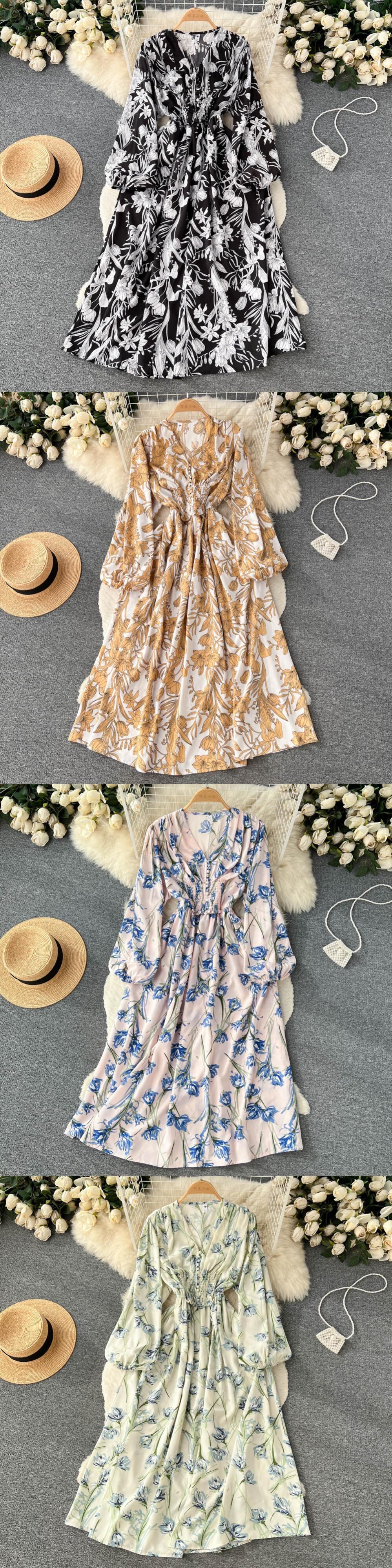秋のドレス女性フローラルプリントドレープパフスリーブビッグスイング Vestidos シンローブバケーションビーチ オータム 秋物 花柄 Abe24438284255