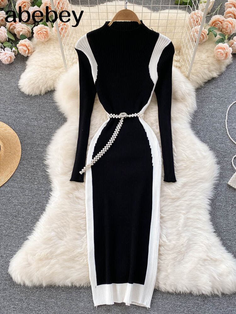 パネルセータードレス 2022 女性スタンドネックロングスリーブシニアパールベルトスリムパーティーミディロングknitteドレス 長袖 ハーネス 真珠 Abe25365425308