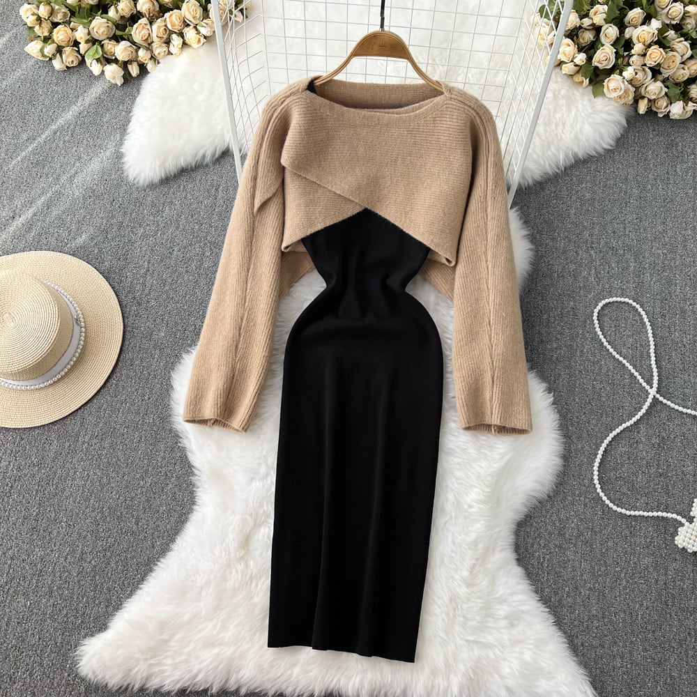 2022 固体ニット女性セットルーズロングスリーブトップセーター + 固体弾性ドレスフレンチスタイルのツーピースセット 長袖 エラスティック 伸縮 ソリッドカラー Abe5170892701