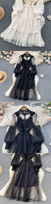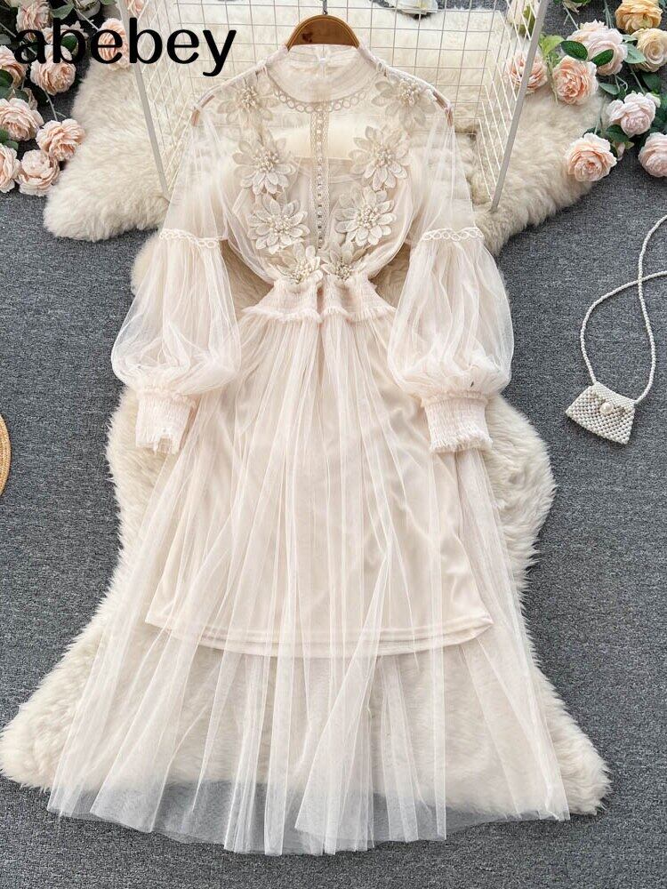 2022 女性ドレススタンドカラーランタンスリーブメッシュドレスシースルーレース刺繍妖精ドレス Vestidos ローブ Abe36998512896