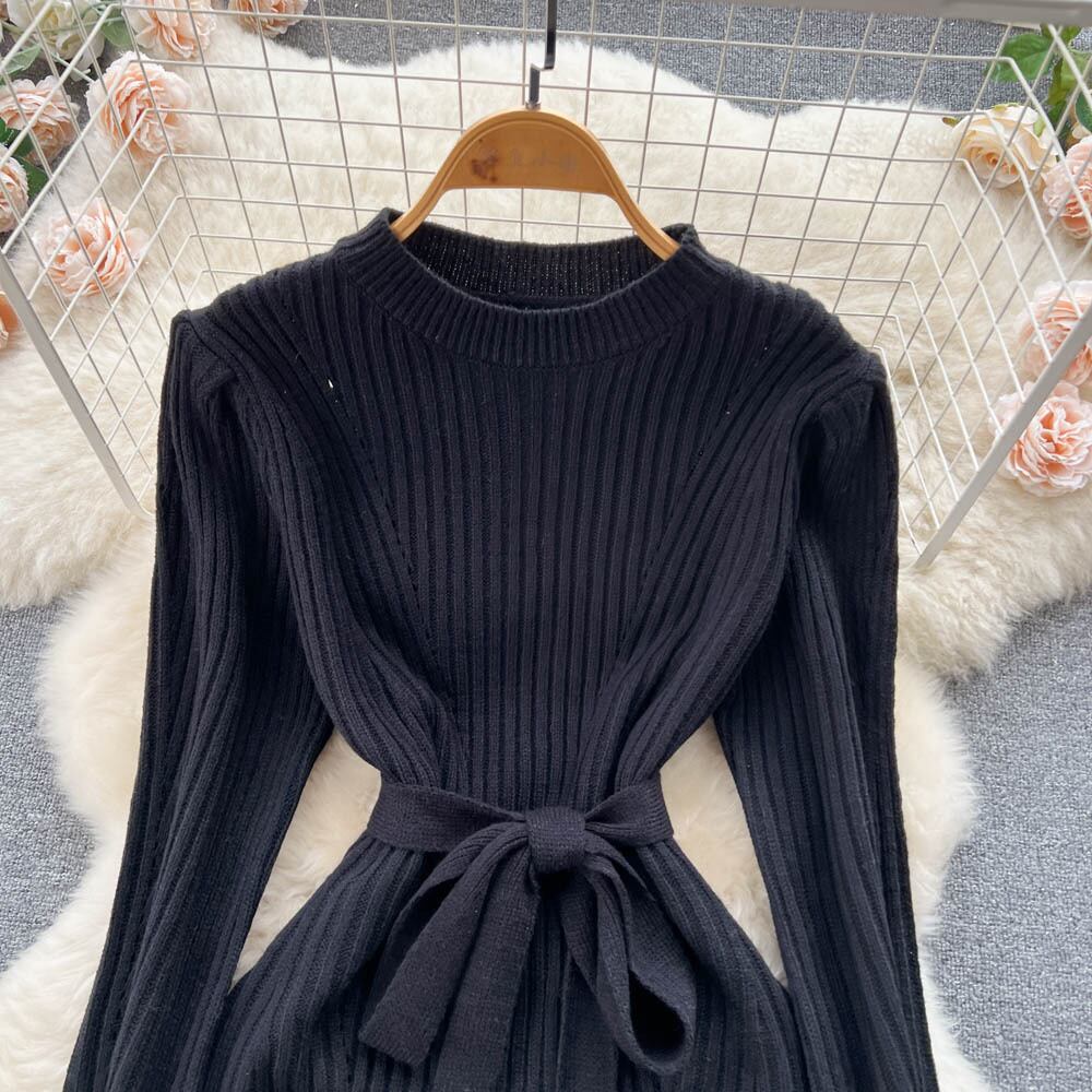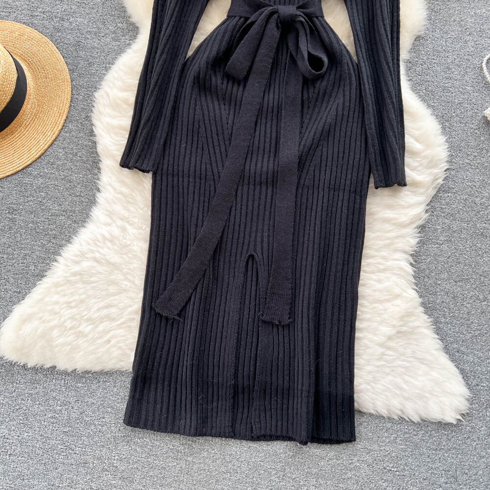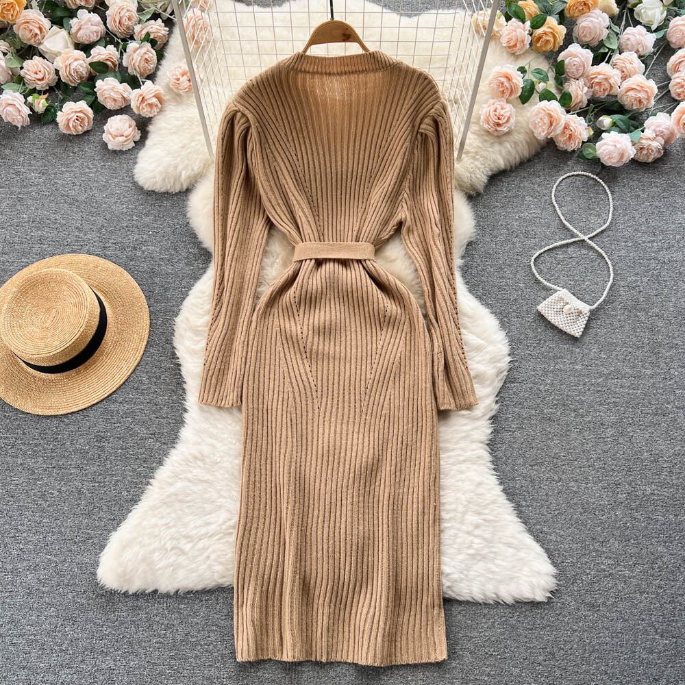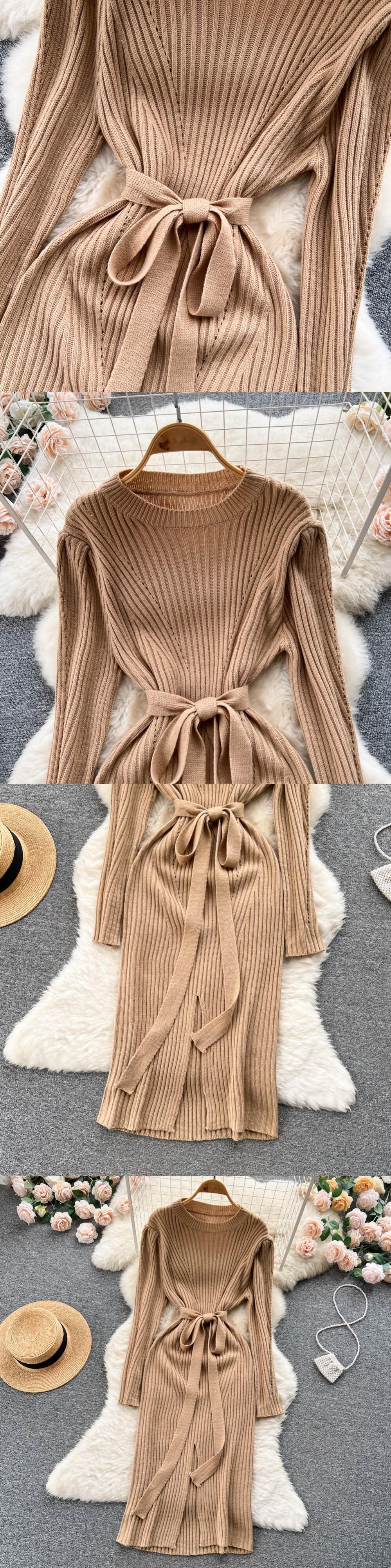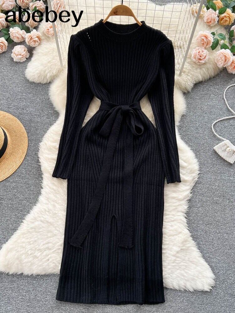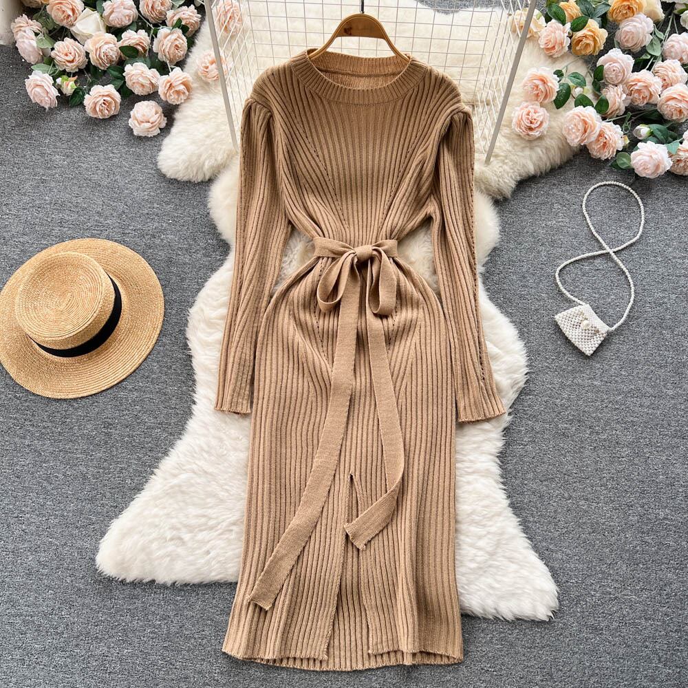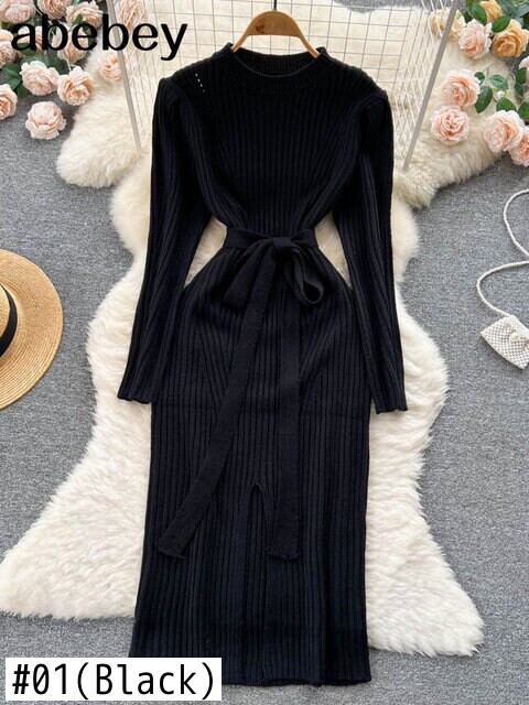 2022 秋のセクシーなニットドレス長袖気質ニットウェアシース O ネック固体女性パーティースプリットセーターロングドレス オータム 秋物 Oネック ソリッドカラー Abe88893965789