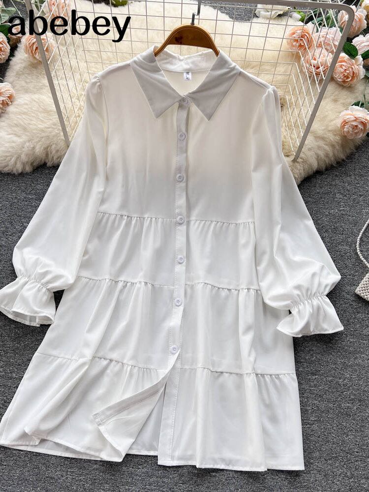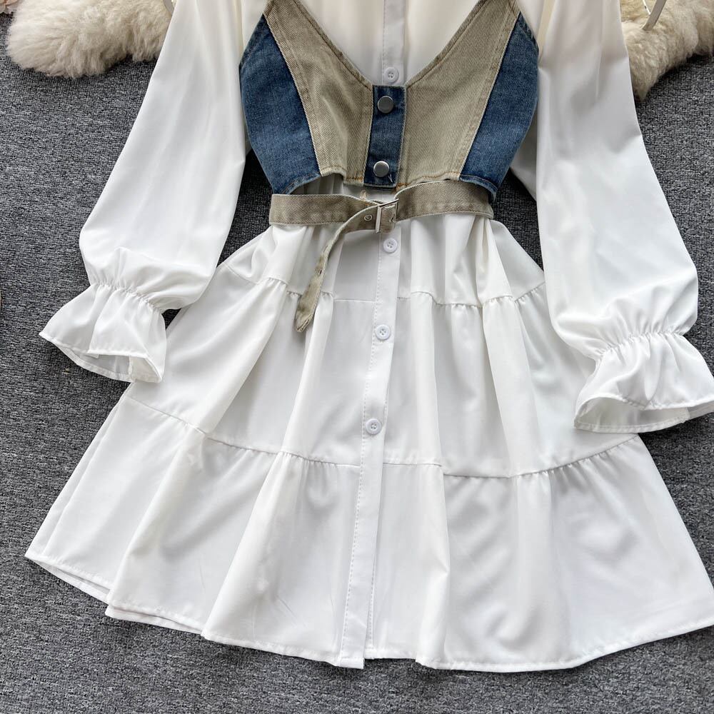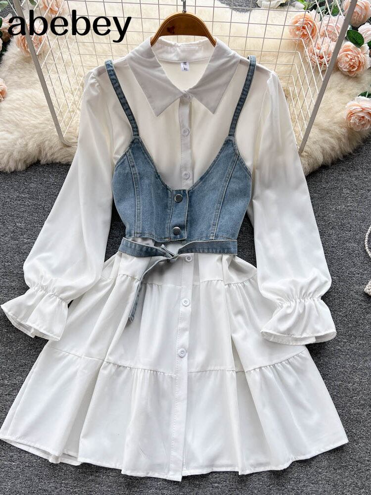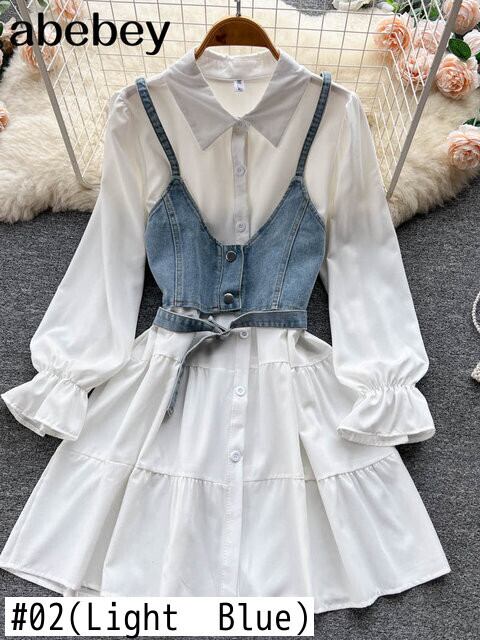 2022 女性服衣装無地長袖白の基本的なシャツドレス黒デニムベスト 2 点セット衣装服 ロング ホワイト ブラック ソリッドカラー Abe8355462969