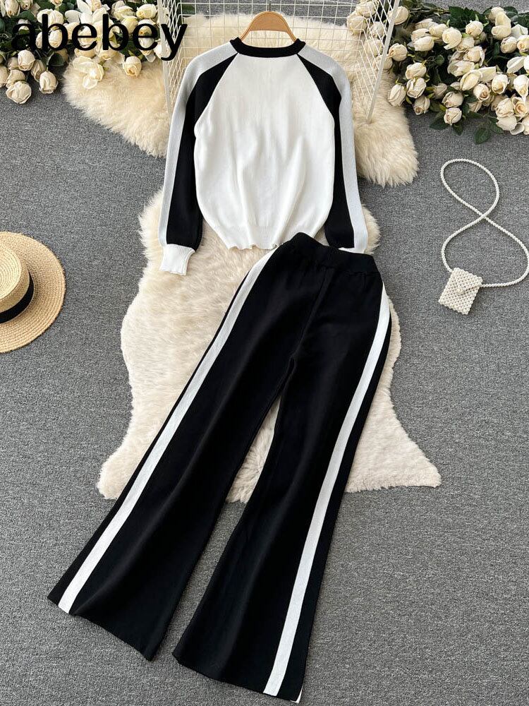 パッチワーク 2 ピース セーター セット女性トラック スーツ セーター + ルーズ ズボン シックなプルオーバー セーター + ニット キャロット パンツ セット Abe35874393468