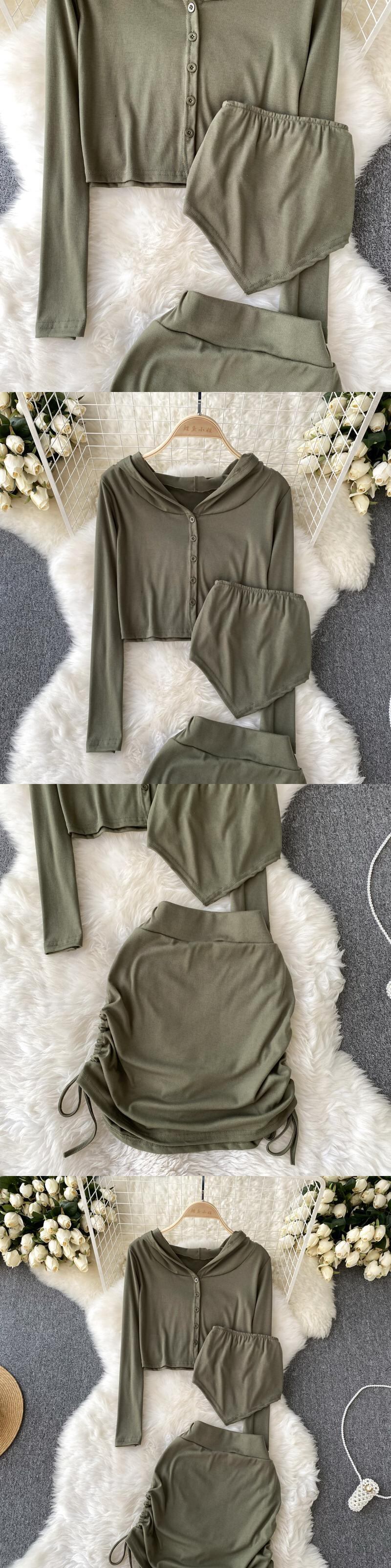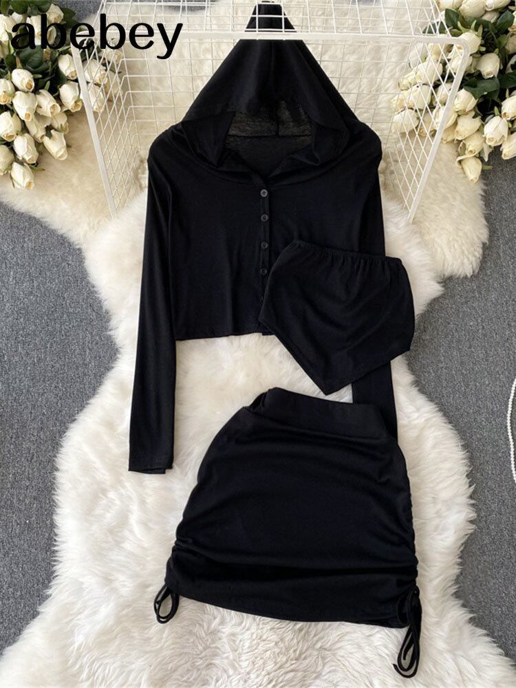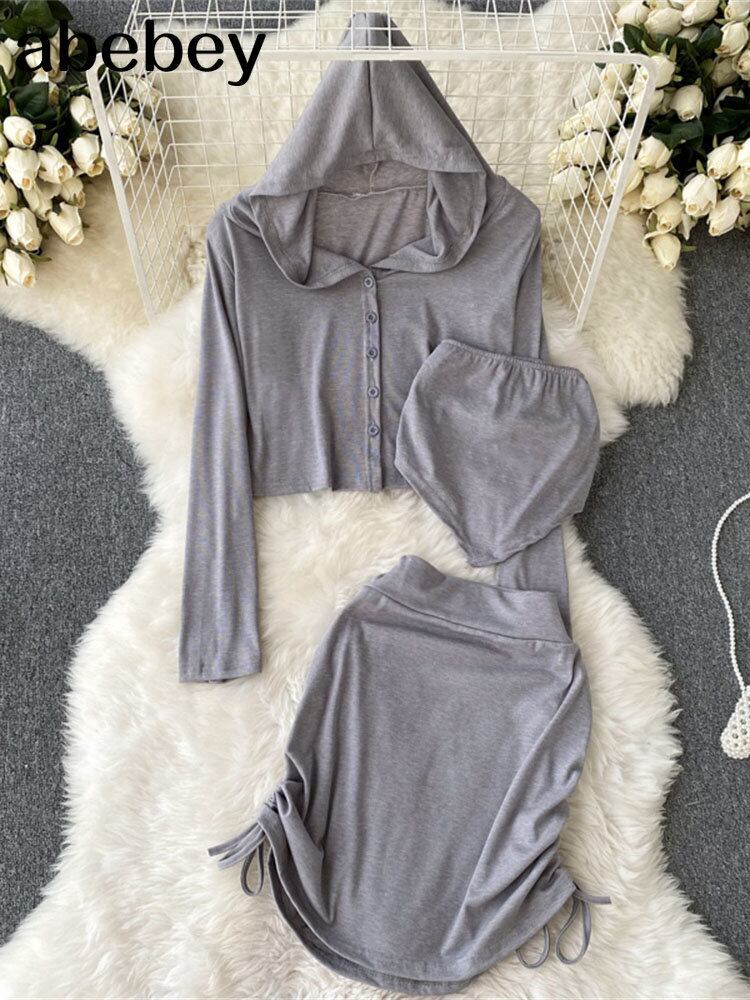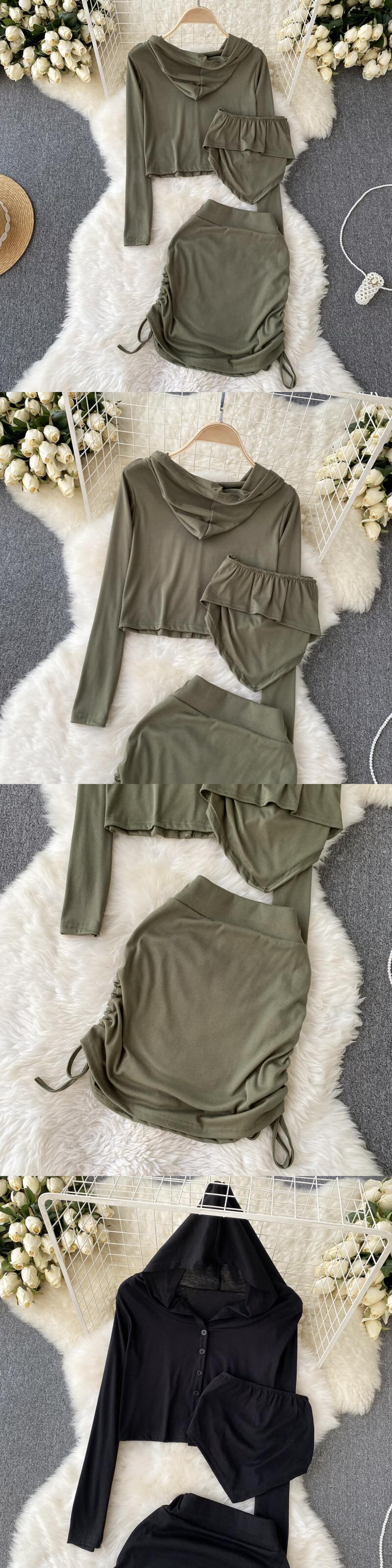 長袖ショートフード付き無地カーディガンコート + ストラップレスラップ胸 + ラップヒップ巾着スカート女性の夏の 3 ピーススーツ ロング サマー 夏物 ソリッドカラー Abe39888298466
