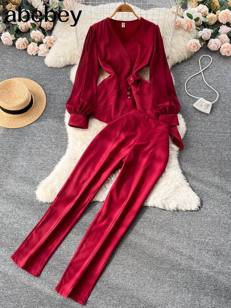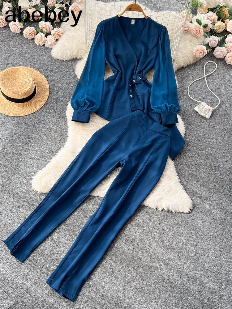 女性プロフェッショナルOLラペル長袖スーツルーズロングスリーブトップ+ストレートシーススーツパンツ2点セット Abe2815565748