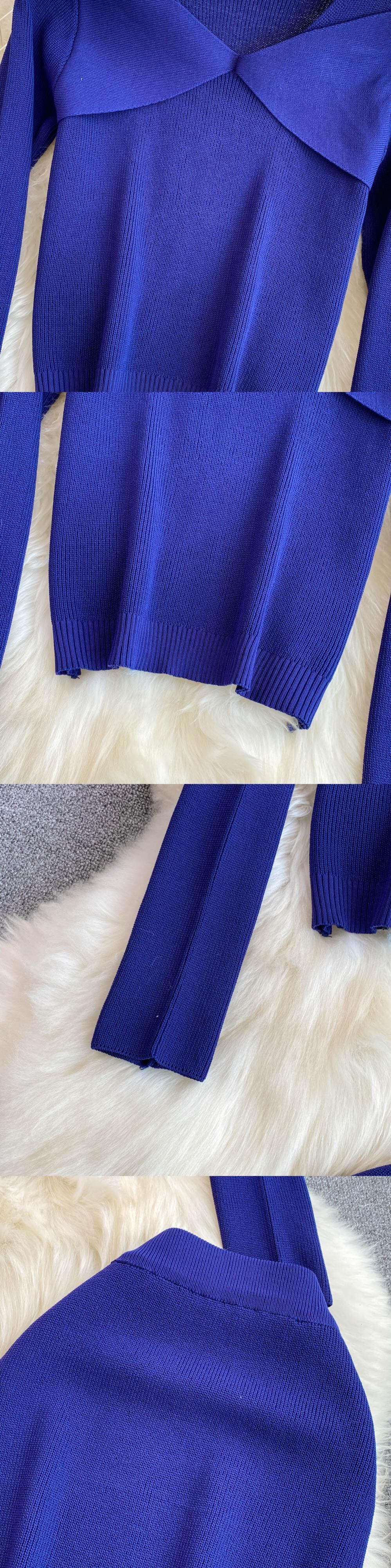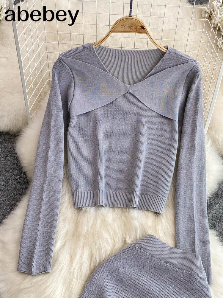 2022 秋と冬の女性のツーピーススーツスタイルニット V ネックニットセーターラップヒップスカートツーピーススーツ オータム 秋物 ウィンター 冬物 Vネック Abe22344142511