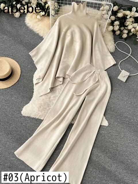 冬のツーピーススーツ長袖ニットタートルネックプルオーバー + 弾性ウエストワイドレッグパンツルーズセーターセット ロング エラスティック 伸縮 ウィンター 冬物 ワイドパンツ Abe50583642770