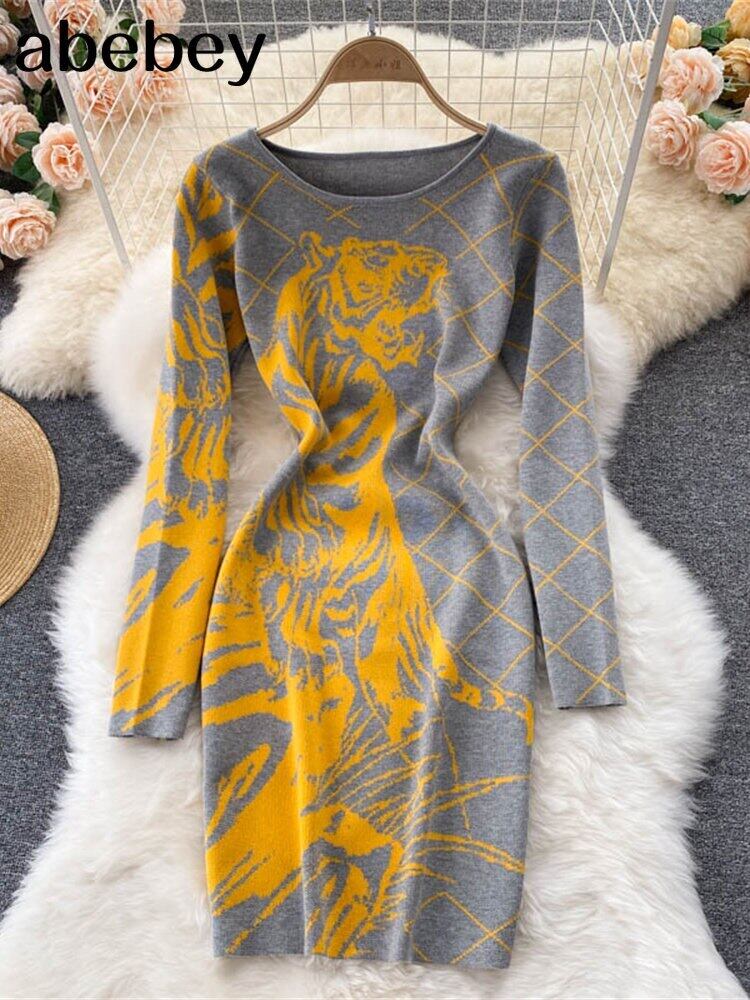 虎 Vinage プリントアニマルニットドレス女性長袖弾性ウエスト暖かいドレスパーティーセーターミニドレス ロング エラスティック 伸縮 Abe51949805894