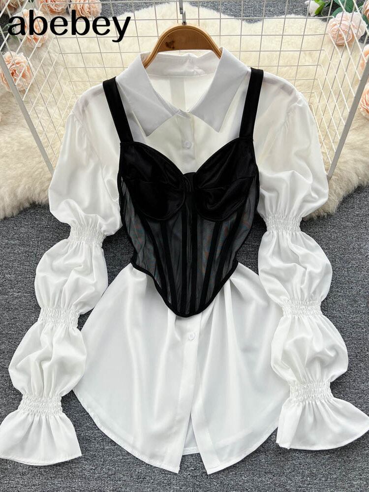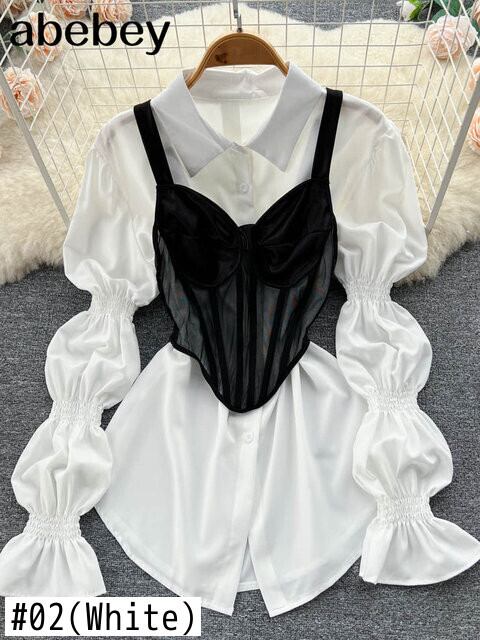 秋のドレス二枚スーツラフスリーブ白シャツドレス + ミニ黒キャミソールスーツ女性ストリートスリムセット ホワイト ブラック オータム 秋物 Abe88619769638