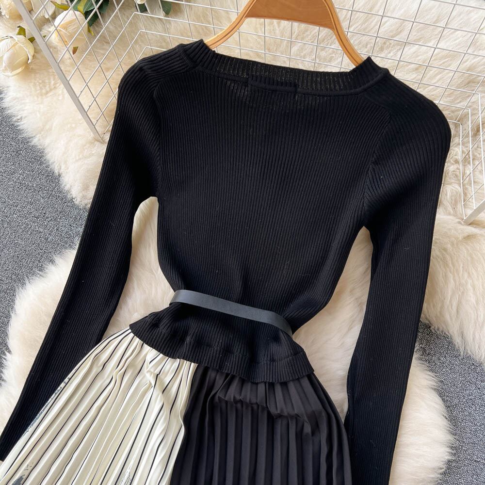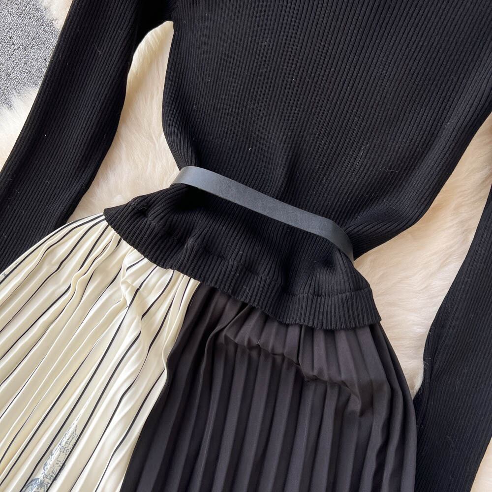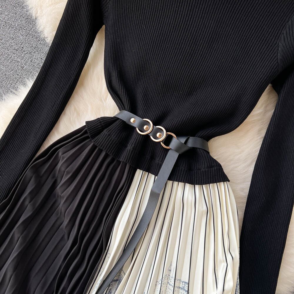 2022 女性プリーツドレス長袖スプライスプリント A ラインドレス秋のシックなストリートロングドレス オータム 秋物 Aライン Abe78934481801
