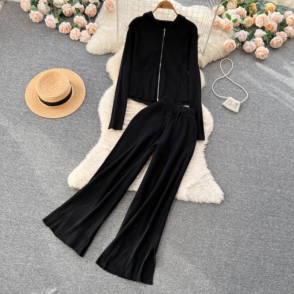 冬のツーピーススーツ長袖ニットカーディガンコート + 弾性ウエストワイドレッグパンツルーズセーターセット ロング エラスティック 伸縮 ウィンター 冬物 ワイドパンツ Abe32985430571