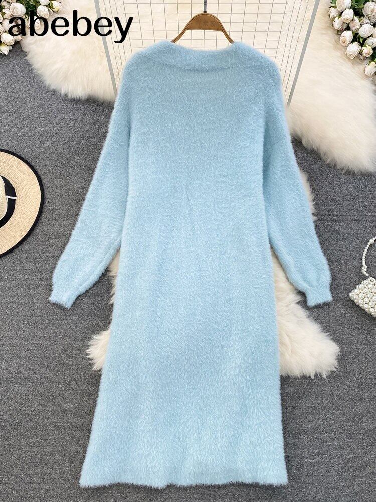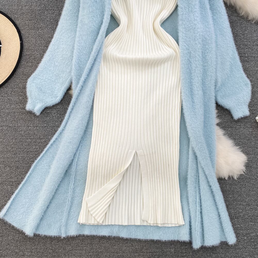 2022 ニット女性セットルーズ長袖ロングカーディガンセーター + 固体弾性ドレスフレンチスタイルのツーピースセット衣装 エラスティック 伸縮 ソリッドカラー Abe19594358625