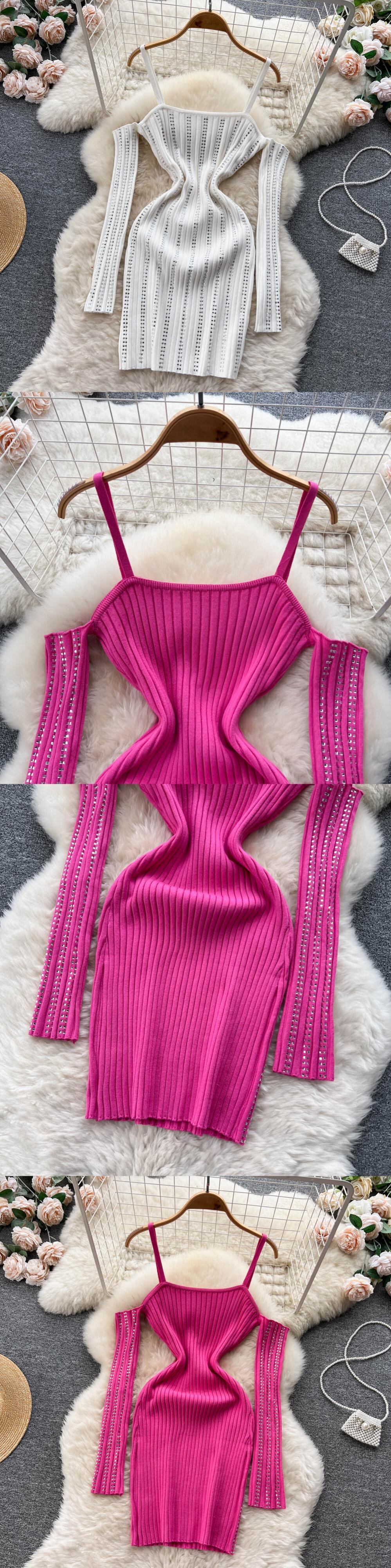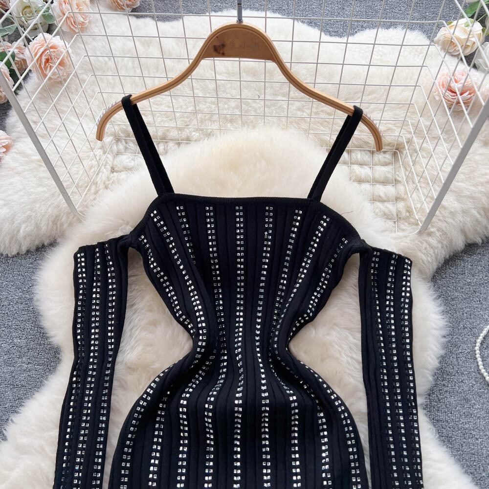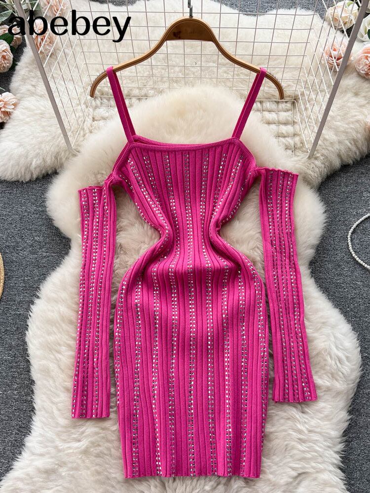 ストラップオフショルダーセクシーなパーティーニットドレス 2022 弾性ウエスト長袖スキニー冬の女性のセーターショートミニドレス ロング エラスティック 伸縮 ウィンター 冬物 Abe55779776444